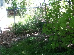 With a little planning and a lot of brush removal this enclosed area at the side of my house would be a good enclosure for a small flock of chickens.