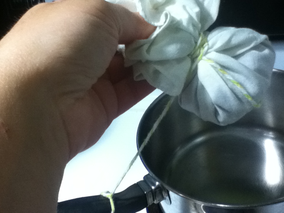 Meanwhile, we infused vinegar with spices. I wrapped them up in a clean white hanky and tied with cotton string.