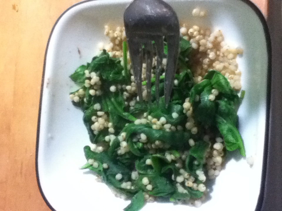 Next, I tried sorghum cooked in liquid. By volume, it takes three parts liquid to one part sorghum. I cooked with plain water so I could taste the grain but broth would work well, also. The same sweet smell wafted from the pot while it cooked. After draining the extra water as the instructions directed I took a taste. The grains have a satisfying chewiness that rice lacks. I added a handful of fresh spinach, a pinch of salt and a dash of curry powder to make a comforting bowl of dinner.