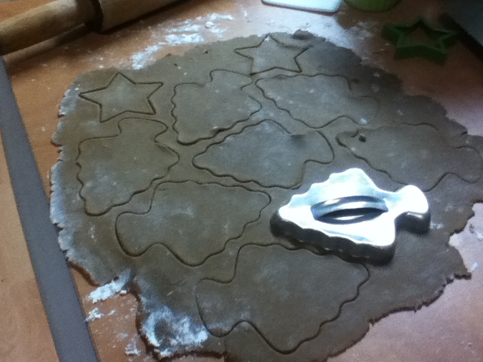 II. Get out some flour, your cookie sheets, a rolling pin, and some cookie cutters. I used a Christmas tree, a star, a bell, and a Gingerbread Man, I mean Person of Dough.