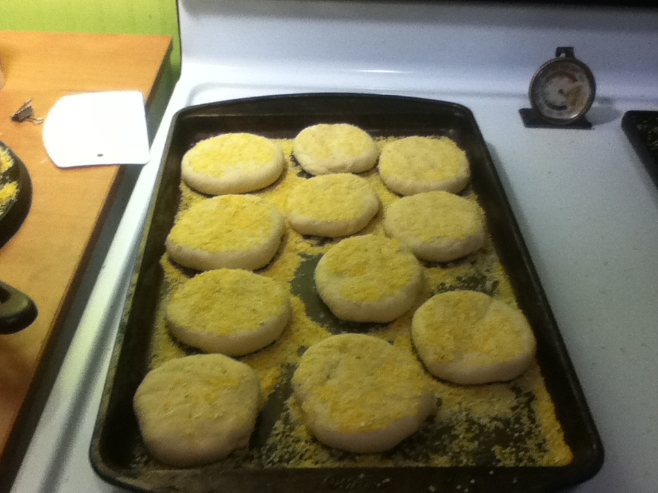 And finally- the griddle! This is what separates English muffins from dinner rolls. I got my griddle heated evenly, spritzed with cooking spray and sprinkled with more corn meal.