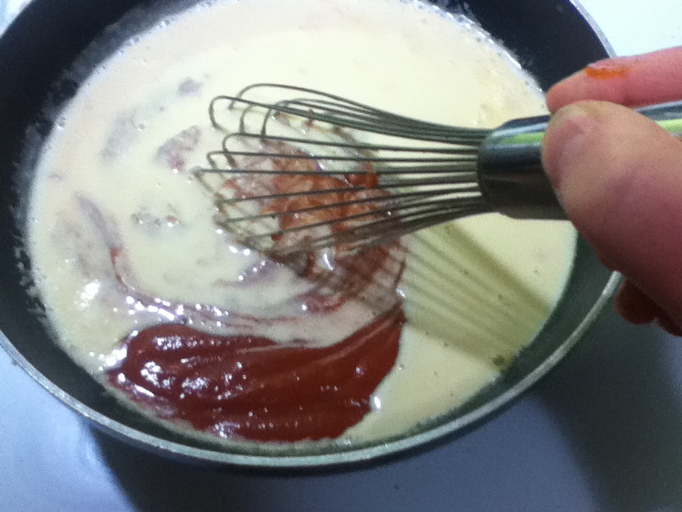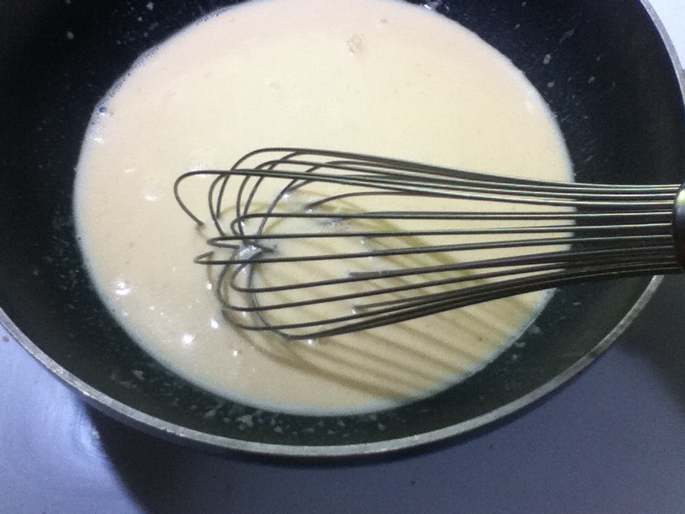 Whisk in 12 fluid ounces of milk (one and a half cups). I used evaporated milk because it is less likely to curdle. You can use whatever milky substance you’d like. Cook this mixture, which is technically a béchamel sauce, over medium heat until it begins to thicken.