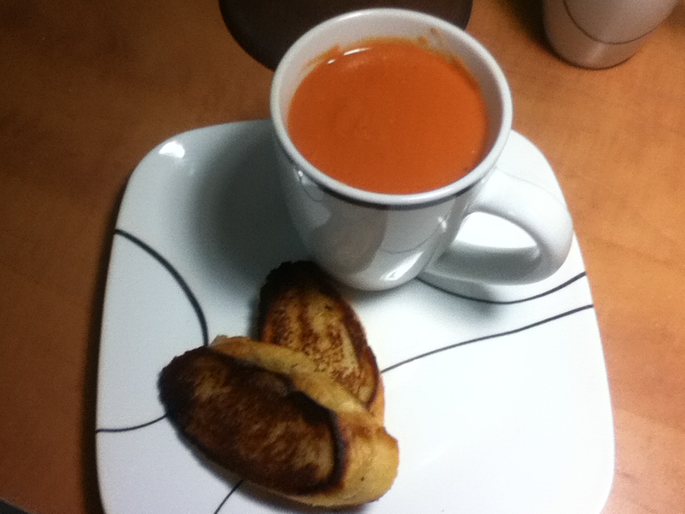 And here is the final product, sitting calmly next to some delicious grilled cheese sandwiches. The Ides of March is my wedding anniversary, and we like to celebrate with our favorite meal. Homemade tomato soup is super easy and super tasty. Give it a try, and share it with someone you love.