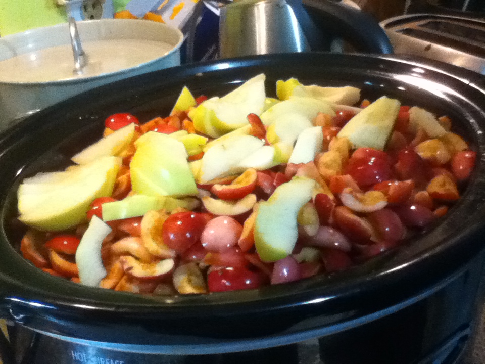 Here are all the crab apples plus two ginger golds I had sitting around. I set the slow cooker to the low setting and left it over night.