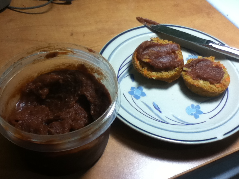 After three-or-so hours the apple puree was reduced to a delectable paste. It goes perfectly with carrot oatmeal muffins, as demonstrated here.