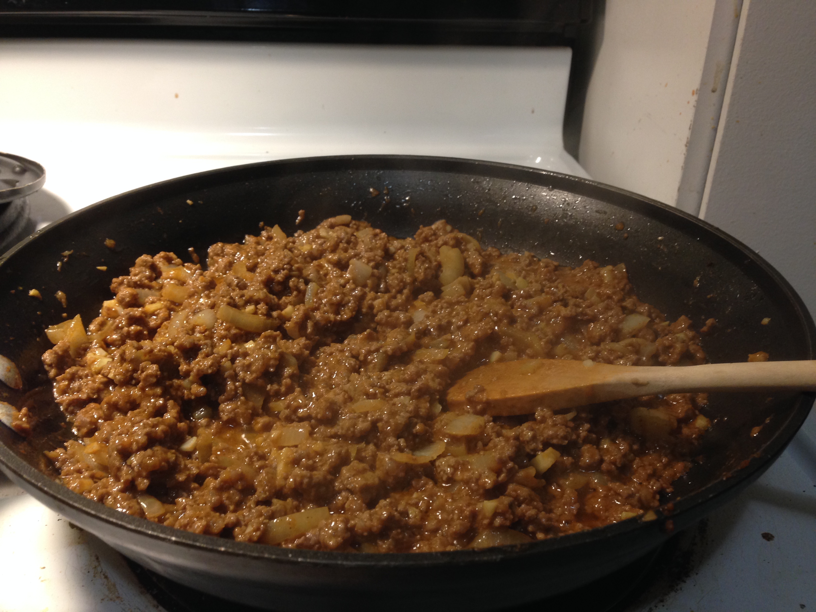 Although I usually have the seeds available for grinding, I am lazy, so I squeezed the yellow bottle like most of us have. I used about ¼ cup total. I also added a dash of cayenne pepper for heat and a dash of allspice for depth. (Seriously, add allspice to any beef dish, it makes a huge difference!) I realized that I mixed up too much sauce, so I added half to the pan and put the rest in the refrigerator for future experimentation.