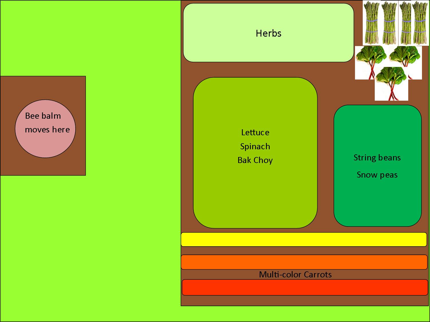 As you can see, we have asparagus and rhubarb already in place. Right now, the bee balm is in the middle of the main plot, but as you can see I plan to move it to the side plot so we can give the plants some fresh soil. Lettuce should be an interesting experiment,as we can probably get multiple plantings in the same space during a single season. I plan to plant cool weather-