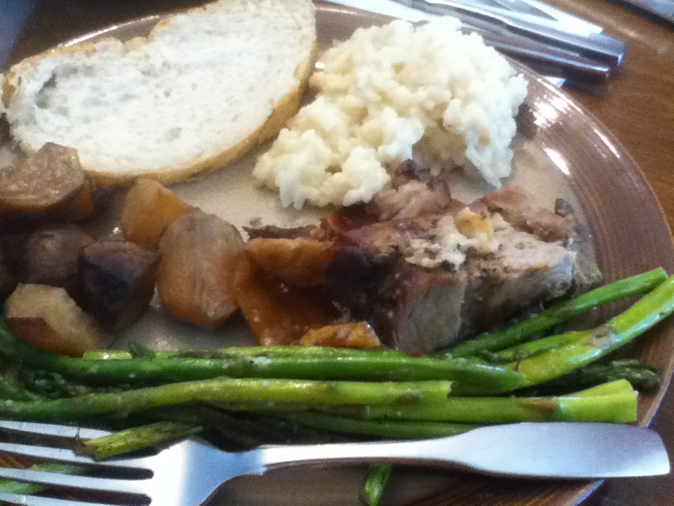 A lovely pile of risotto plated with some roasted pork loin, asparagus, roasted fresh beets and rustic bread. That’s a celebratory meal!