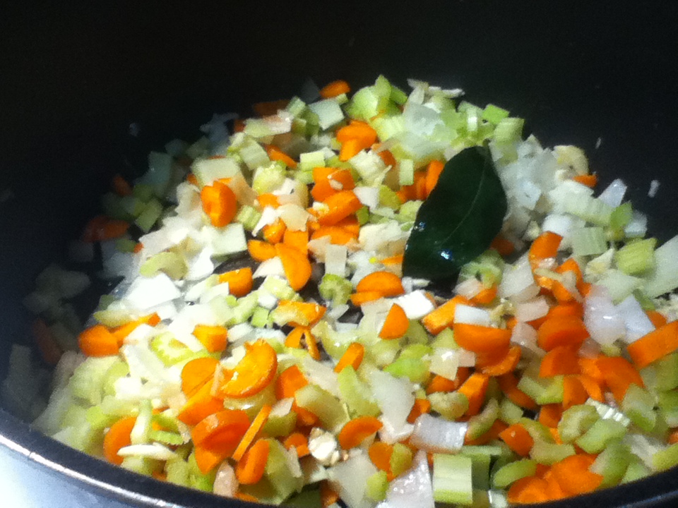 Aromatics, assemble! I use all of them- onion, garlic, celery, carrots, and a big old bay leaf. Sweat it all down with just a little sprinkle of salt, it takes about 15 minutes or so.