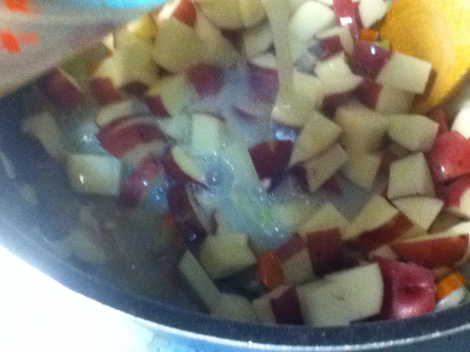 Here’s the liquid from six 6.5 oz cans of clams. Let the potatoes simmer for 20-ish minutes or until cooked through. The time really depends on how small your potato chunks are. This is also a good time to add a good amount of black pepper, a small handful of parsley (about a scant quarter cup) and two teaspoons of thyme. Being as it is early April I have only the dried forms of these herbs, but use fresh if you have them.