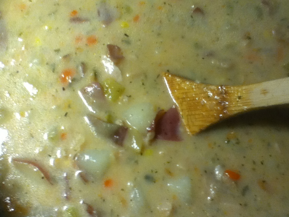 Not a great picture, but you want to smash some of the potatoes. The starch thus released will add just a little thickness to the final chowder.