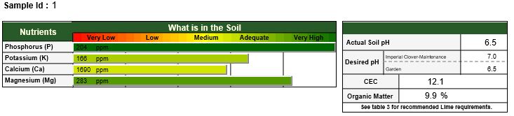 According to the soil testing people, our soil pH (acid/base balance), percentage of organic matter, and phosphorus were just fine! They recommended some 10-10-10 fertilizer, plus some 34-0-0 and 0-0-60.