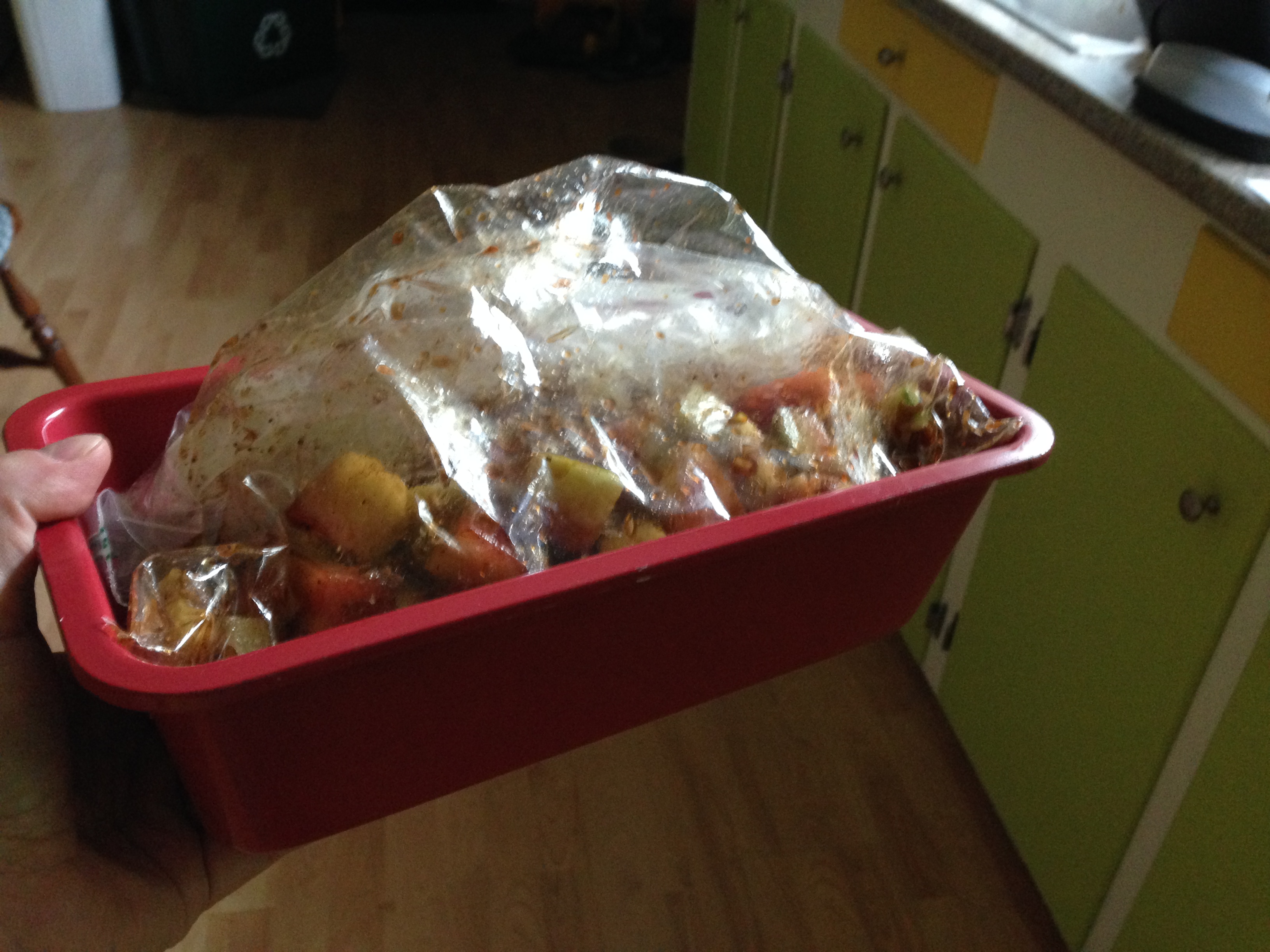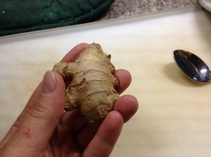 Step 1: Peel and chop a knob of ginger and five decent sized cloves of garlic. Mix 1/2 cup each soy and teriyaki sauces, 1/4 cup Shanxi (Chinese black) vinegar, 1/4 cup ketchup and 1/4 cup toasted sesame oil. Put the melon rind in a zippy bag, add the marinade, and carefully smoosh it all around to coat evenly. Stash in the fridge for a bit. I let it go about four hours.