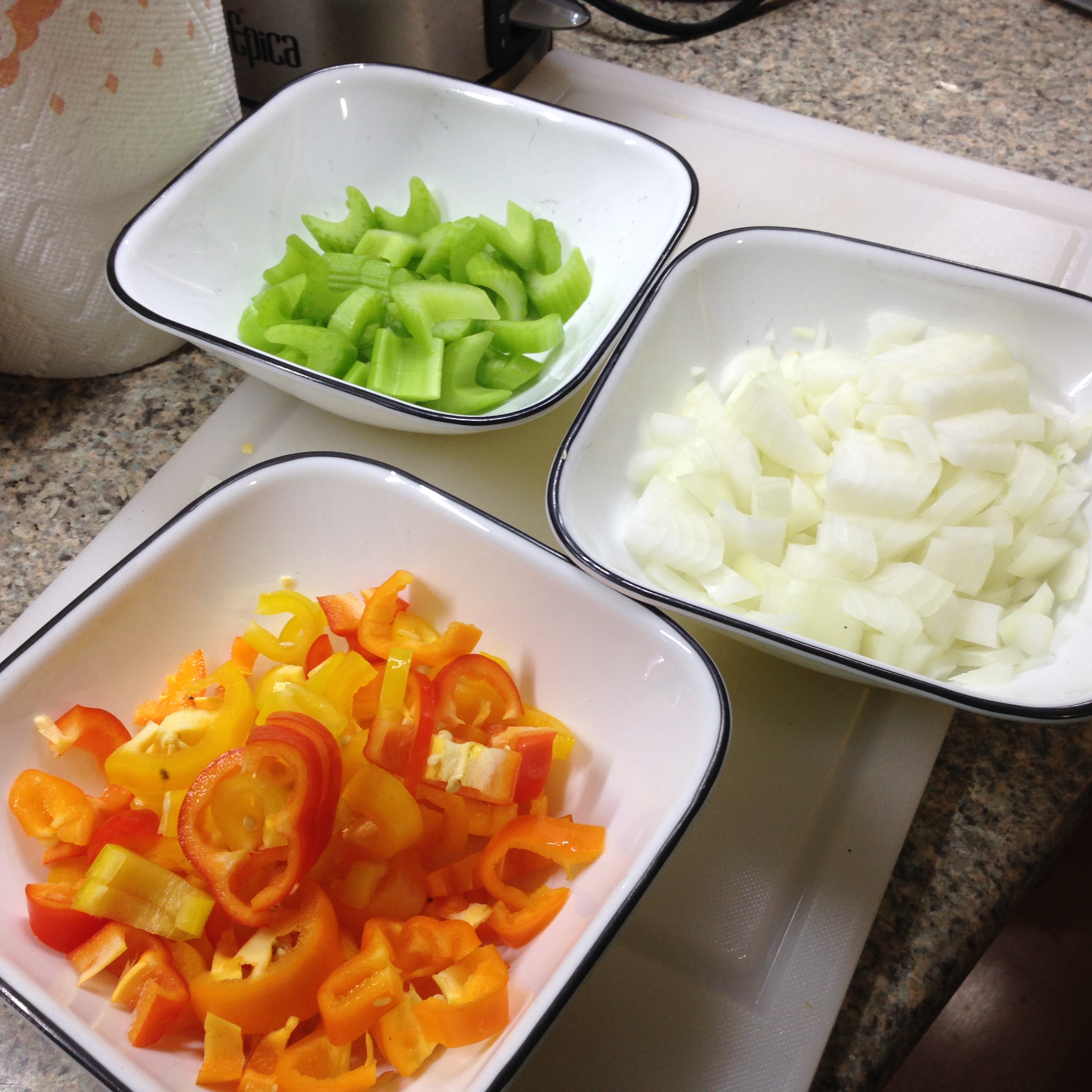 Step 3: Get it together. Chop your veggies before you heat up the pan. Real wok cooking goes fast. You will not have time to fuss over peeling an onion before your oil starts smoking. Not shown here is some stew beef marinated in a little soy sauce. We added that, too.