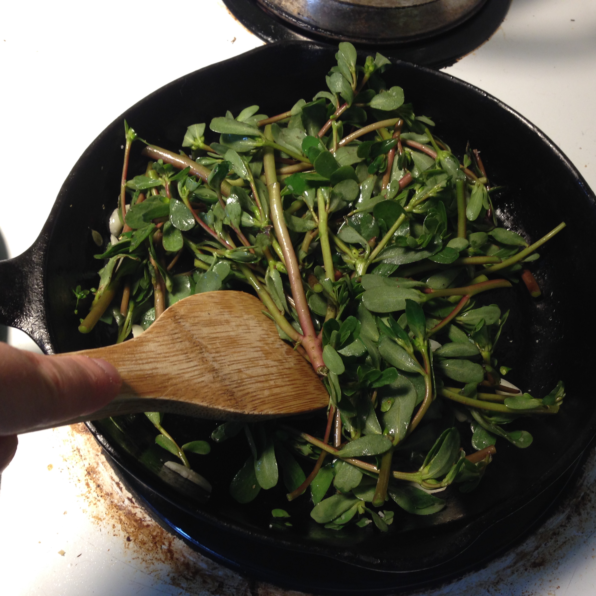 Next, a quick stir-fry with a little slivered garlic and olive oil. Like most greens, the purslane just needs time to wilt. It took only a few minutes.