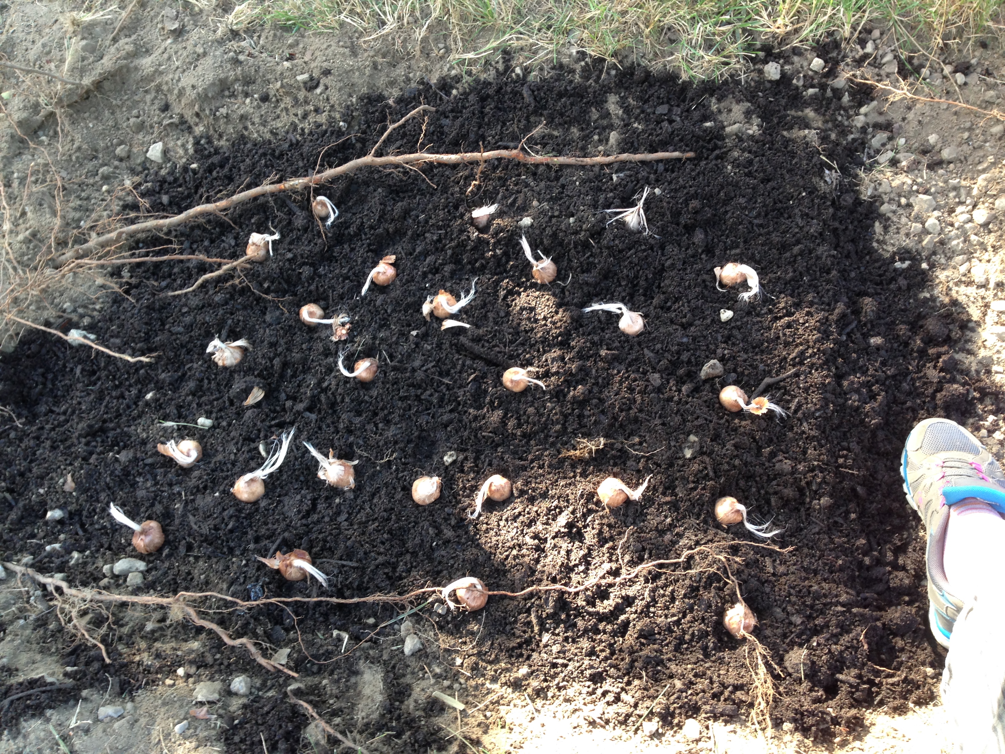 The included planting instructions noted that 12 bulbs could be planted per square foot. I built up a (roughly) two square foot area of manure in the trench I dug and distributed my 25 bulbs.