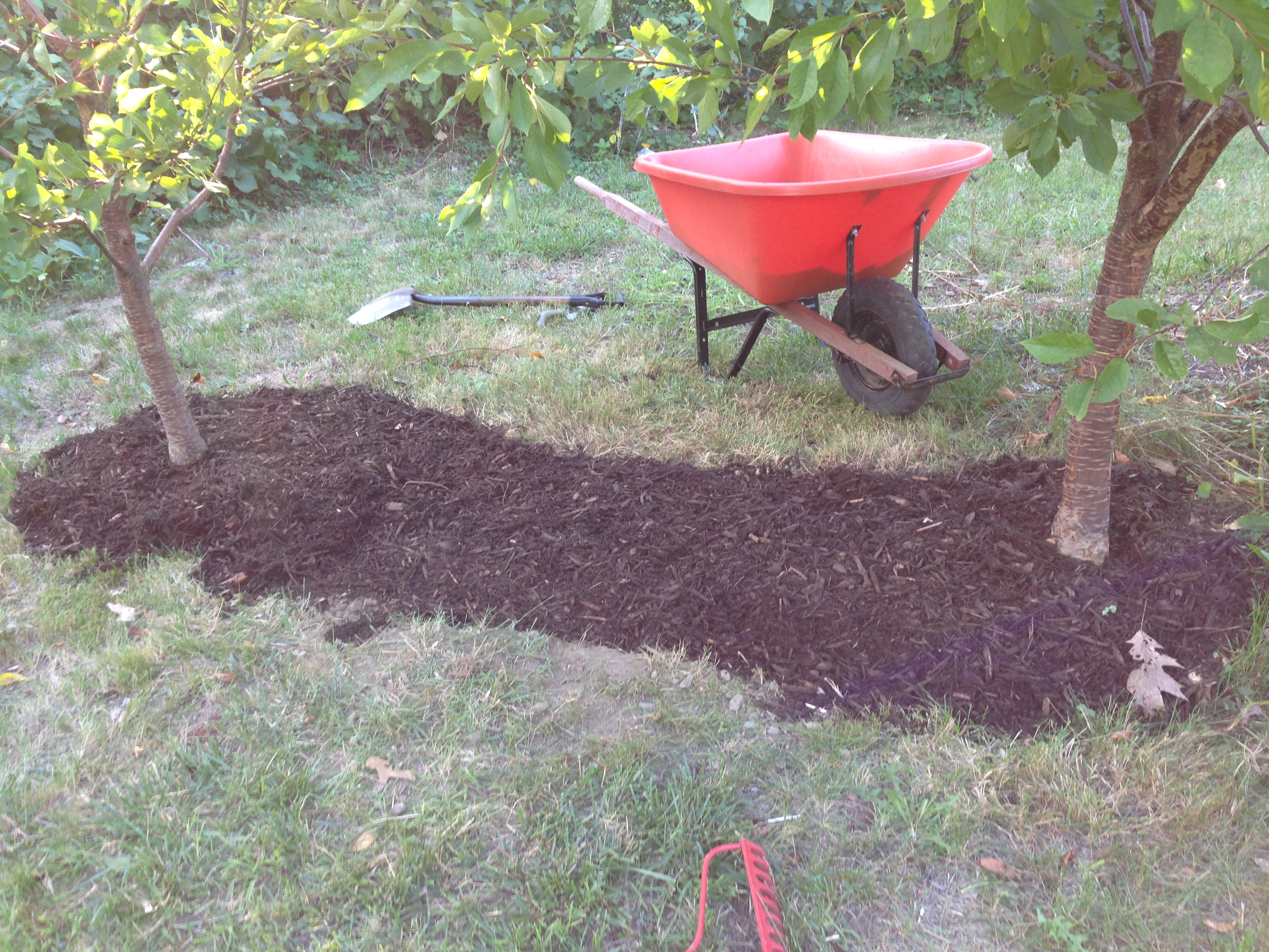 Finally, I topped the crocus bed with a layer of bark mulch. I extended the mulch around the two trees. As my mom always says- you have to do the pretty.