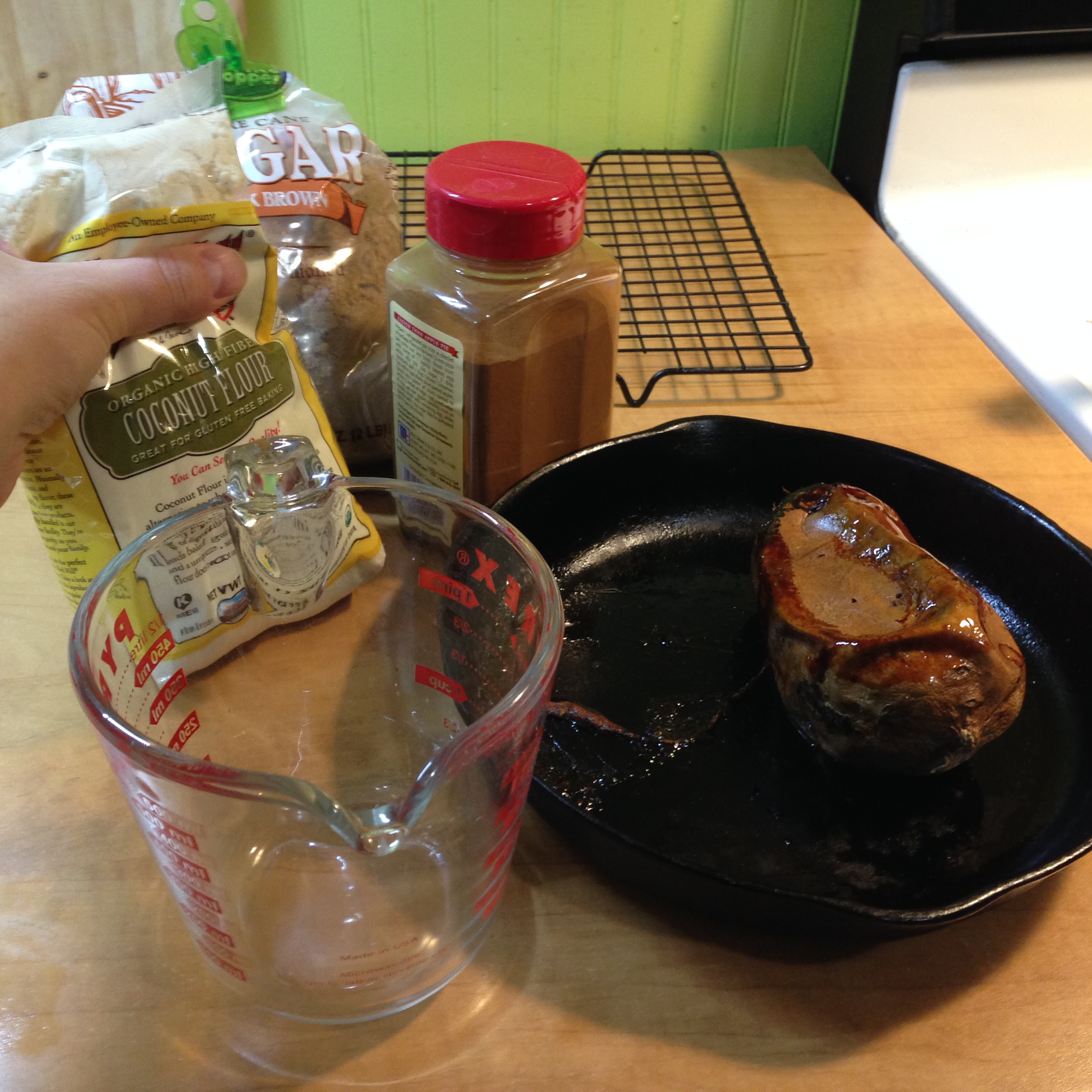 That is one large sweet potato, roasted in its skin. Also shown are cinnamon, coconut flour, and brown sugar.
