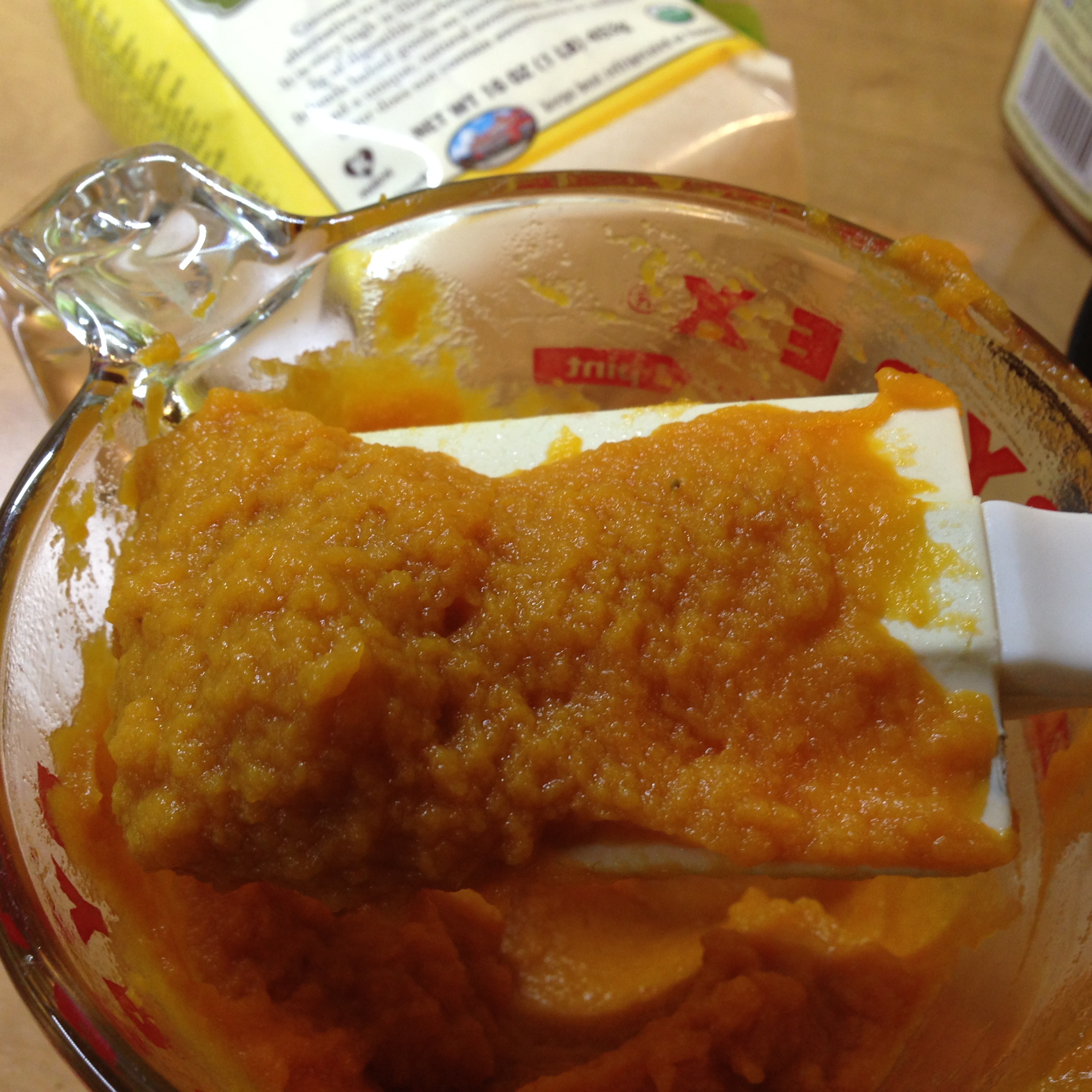 I removed the skin from the sweet potato and hit the baked flesh with my hand blender. A small food processor, stand blender, or a fork and some elbow grease would do the same thing. Really, you just want an evenly textured puree.