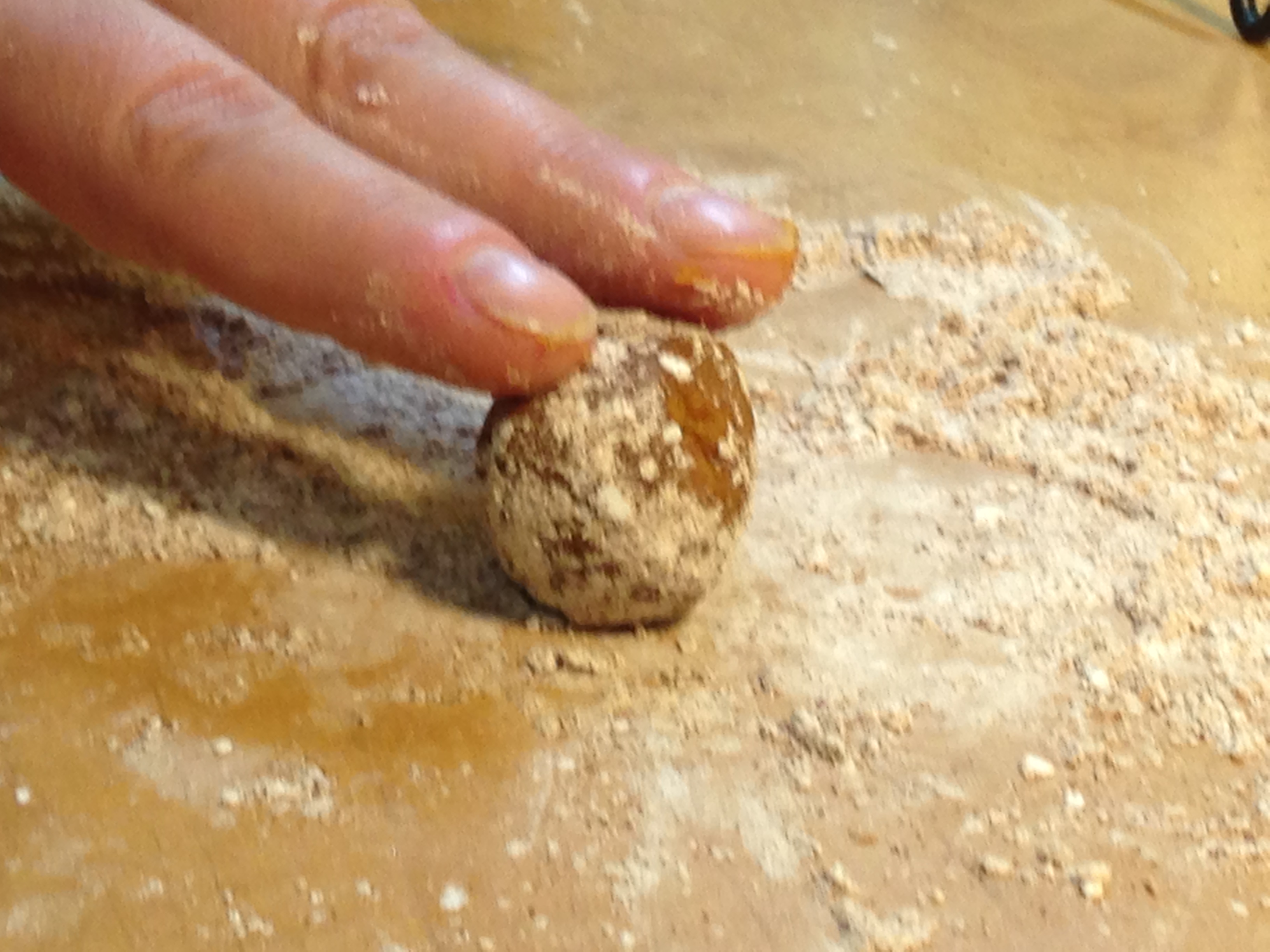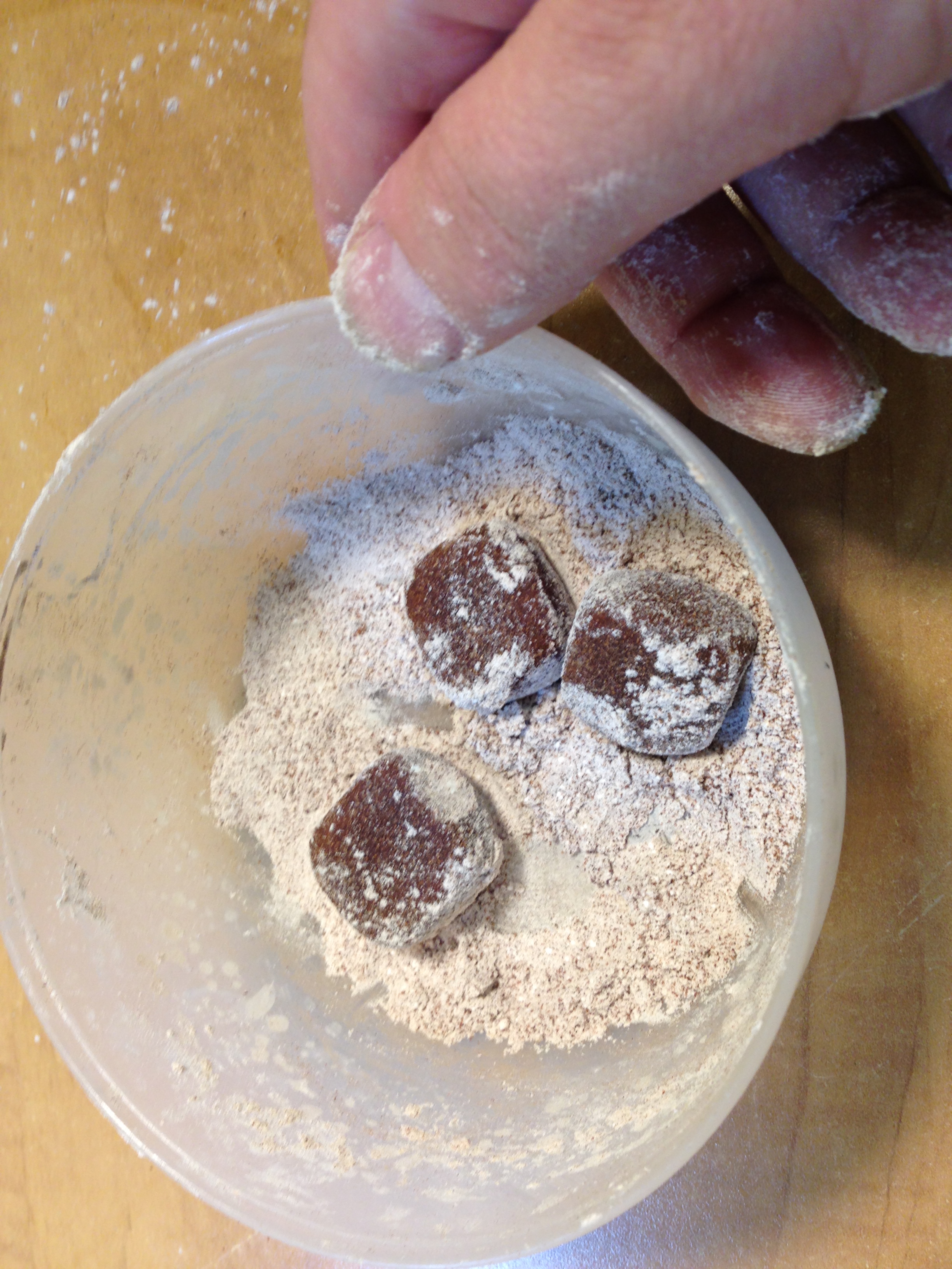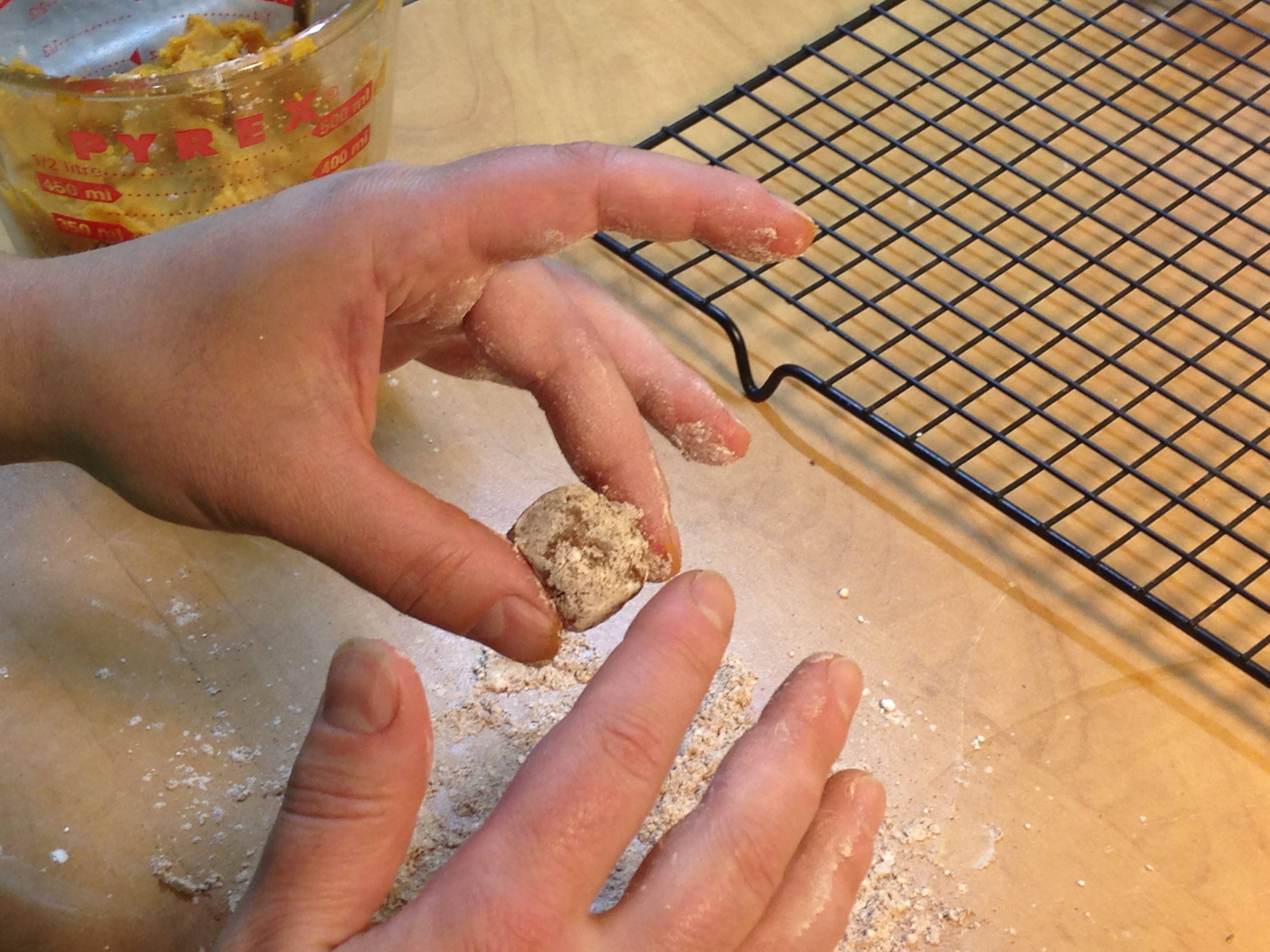 After mixing in two tablespoons of brown sugar, one half teaspoon each cinnamon and vanilla, and six tablespoons of coconut flour I had a nice, stiff dough. I pinched off little lumps and rolled them in a 2:1 mixture of confectioners’ sugar and cinnamon.