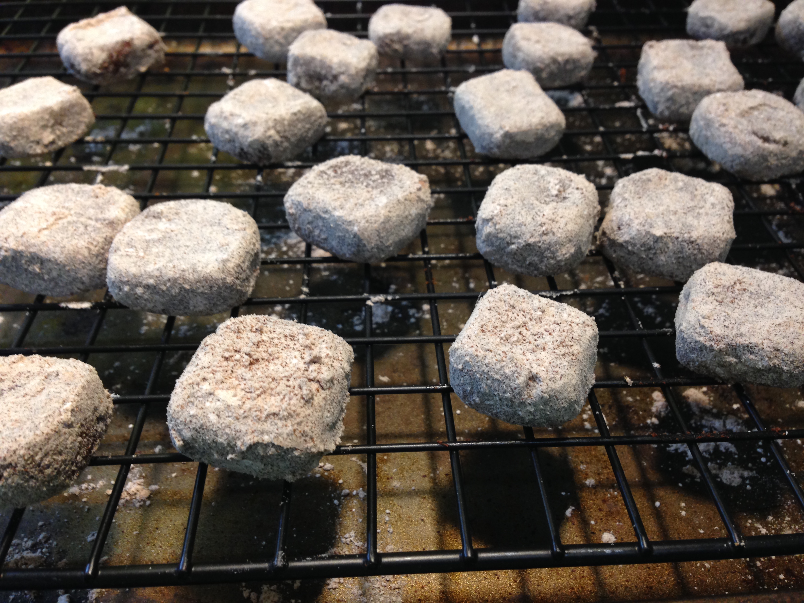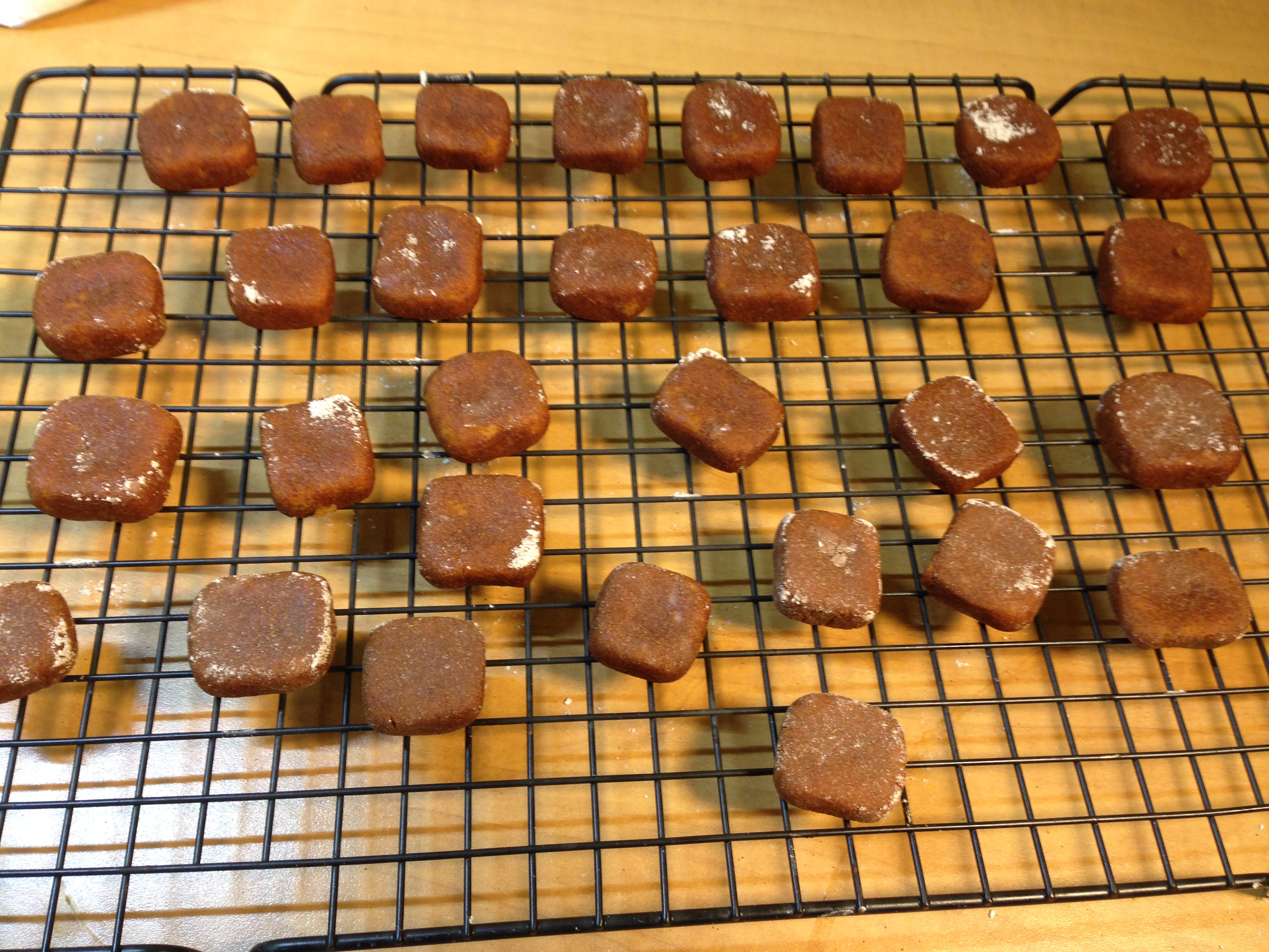 Here they are, on a baking rack. The confectioners’ sugar soaked up some moisture while the candies sat. After a sample, Mr. Food It Yourself and I agreed that the texture was a little too damp. I put the baking rack over a cookie sheet and let the candies sit in a 215F oven for 30 minutes to drive out some moisture.