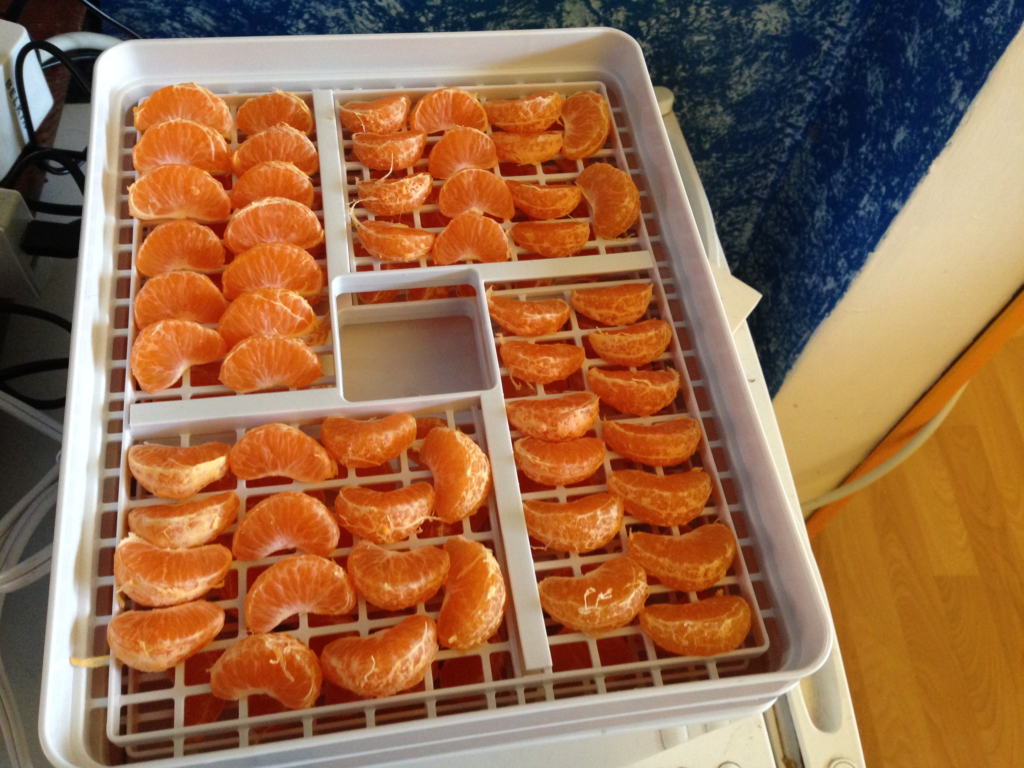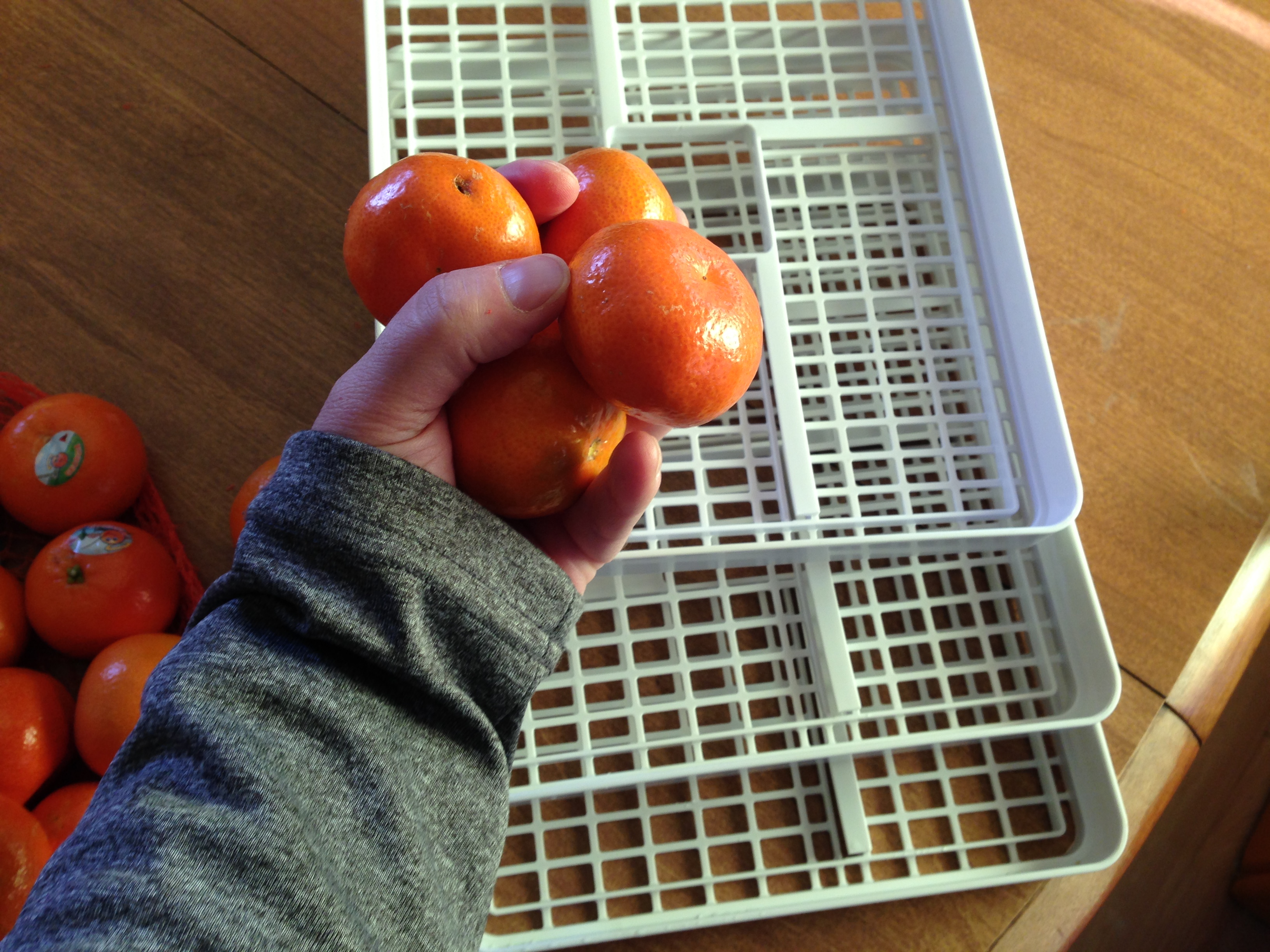 Here are a few impeccably sound tangerines and a few impeccably clean trays from my dehydrator. I only filled two trays, since I had no idea if dry tangerines would be something I like.