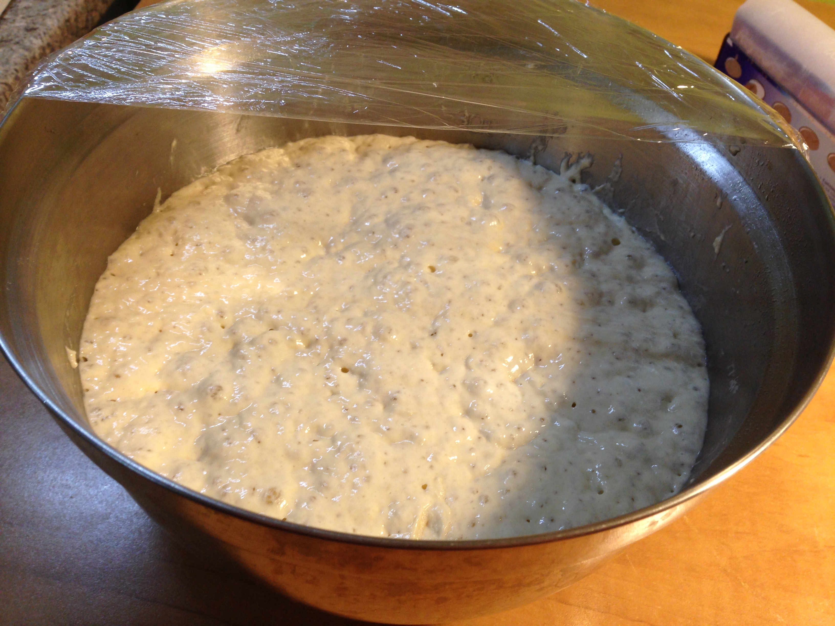 Here is that dough the next morning. There was so much yeast action the bubbles visibly were popping up to the surface.