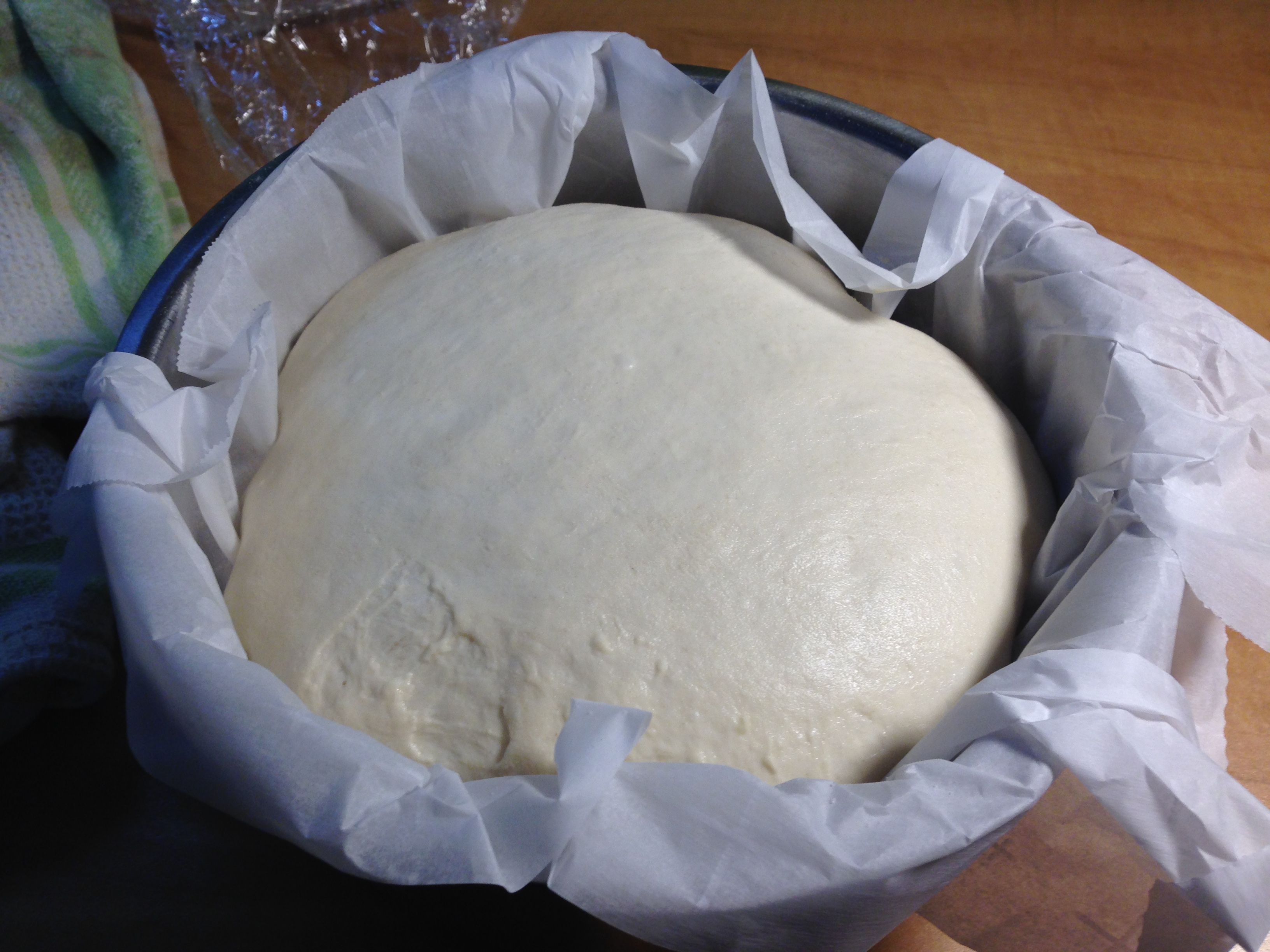 Line your bowl with parchment and sprinkle in some flour or corn meal. I used some coarse semolina flour I had kicking around. Note the parchment sticks up beyond the sides of the bowl. That will be important later.