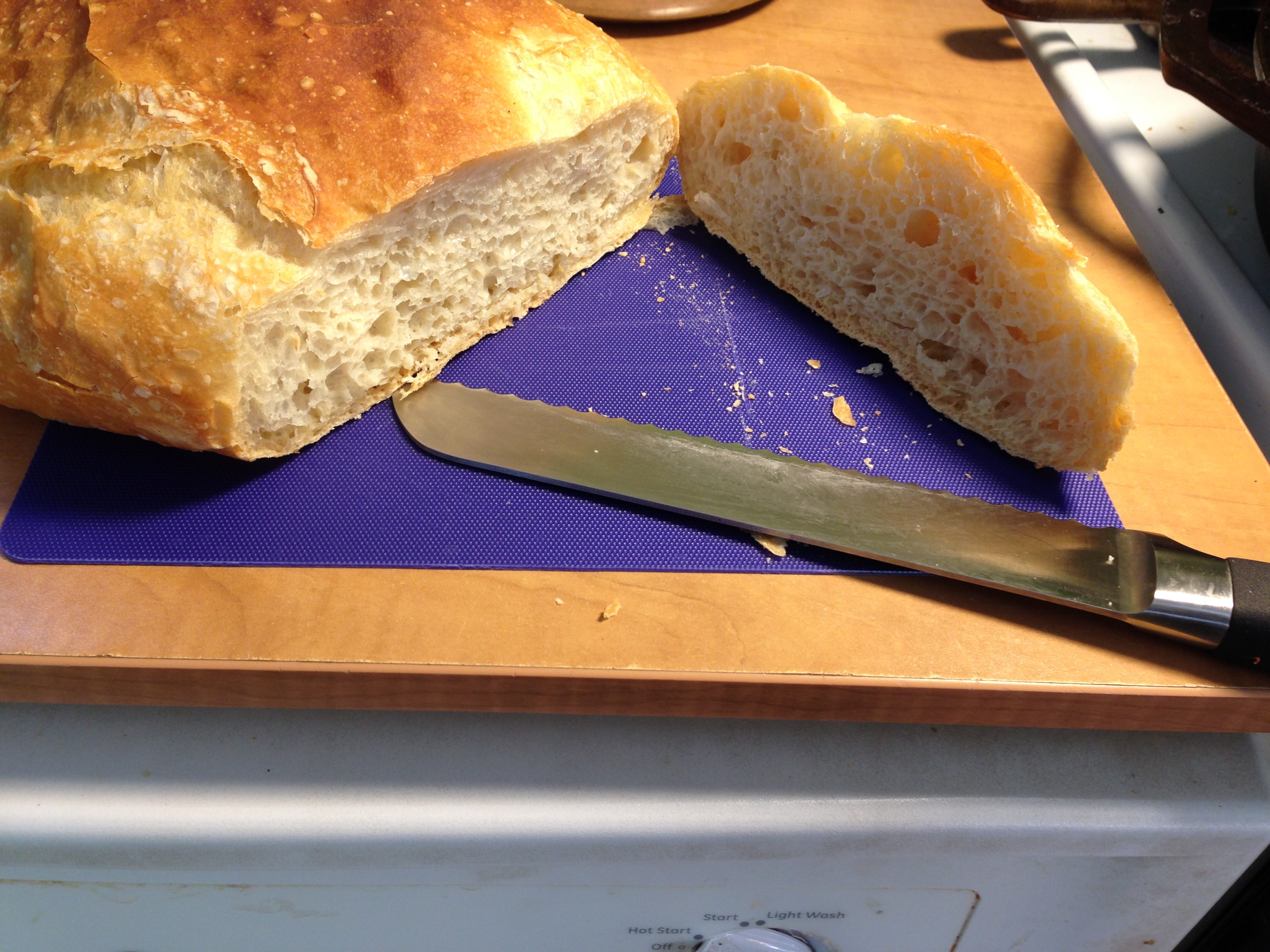 The final product was truly amazing. The crust is crispy, the middle is chewy and full of holes. It has a beautiful translucent crumb, much like a ciabatta. For pennies worth of ingredients, a little patience, and the effort to drag out an under-utilized tool this recipe makes a loaf as good as the expensive “artisanal” breads you can buy at snobby bakeries! Mr. Food It Yourself noted it is the best bread we have ever made. I do not know if I will ever be one of those people who makes all their own bread. However, I will have a really hard time justifying the purchase of a $6.00 boule when I can make one so easily.