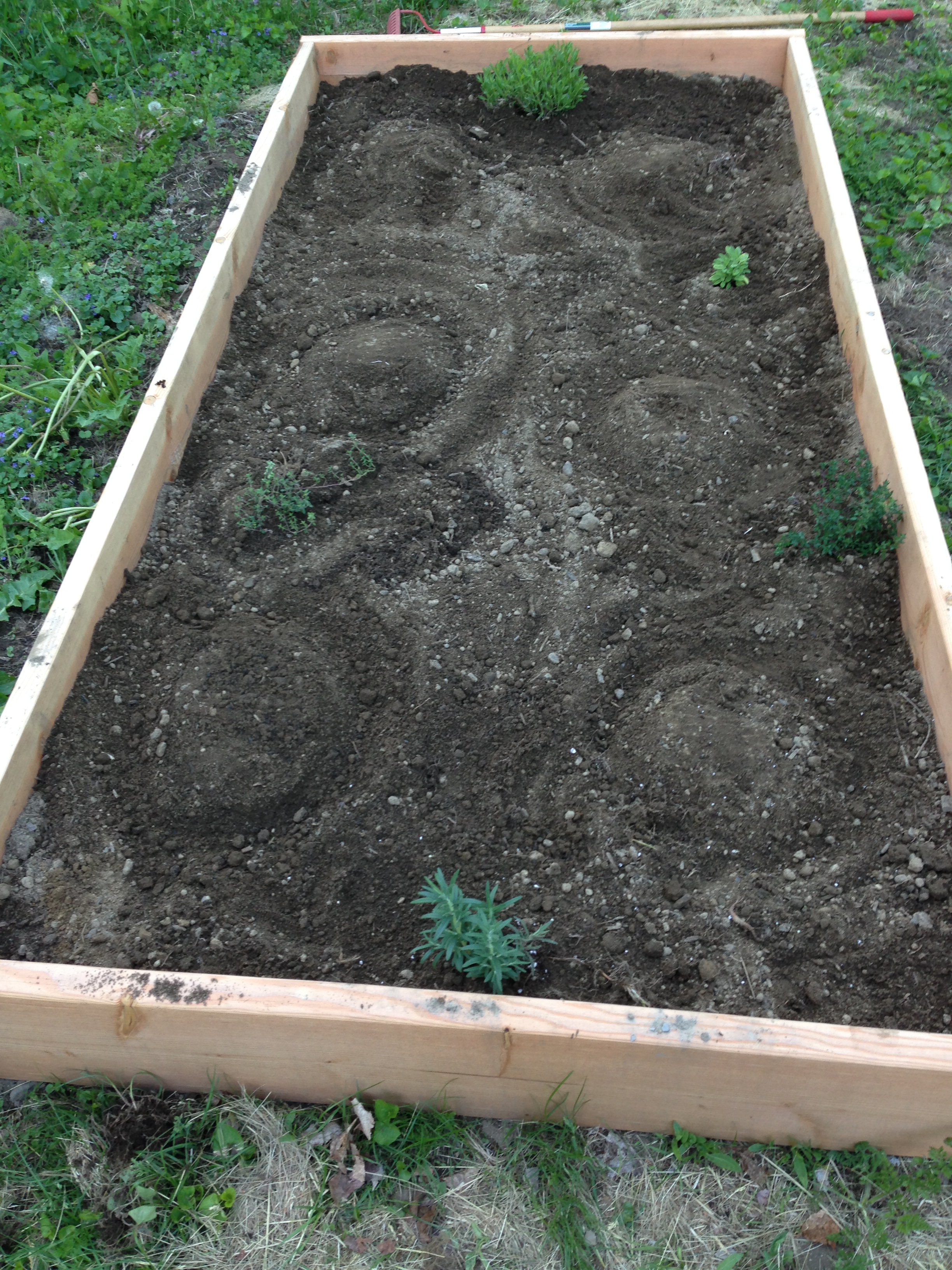 Bed 2: Six hills of zucchini. I could have planted less, but I would still end up with too much. In between, I transplanted my lavender shrub. I also added sage, rosemary, and two thyme plants.