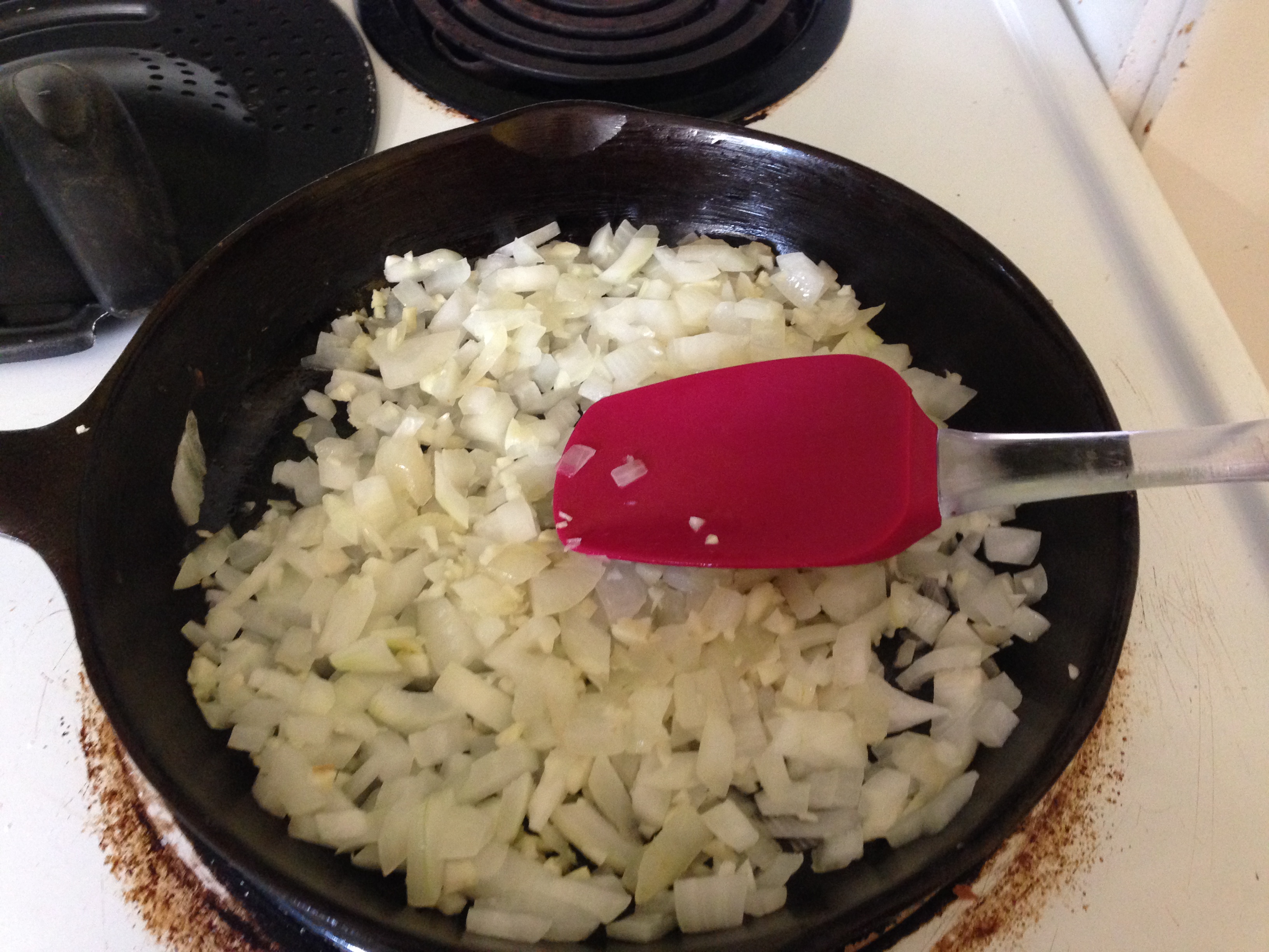 Only took about 10 minutes for the onion and garlic to sweat out. You could totally substitute leeks or shallots here. Mushrooms would be good, too but I know another guest has a serious mushroom allergy. I’ll save that variation for a different crowd.