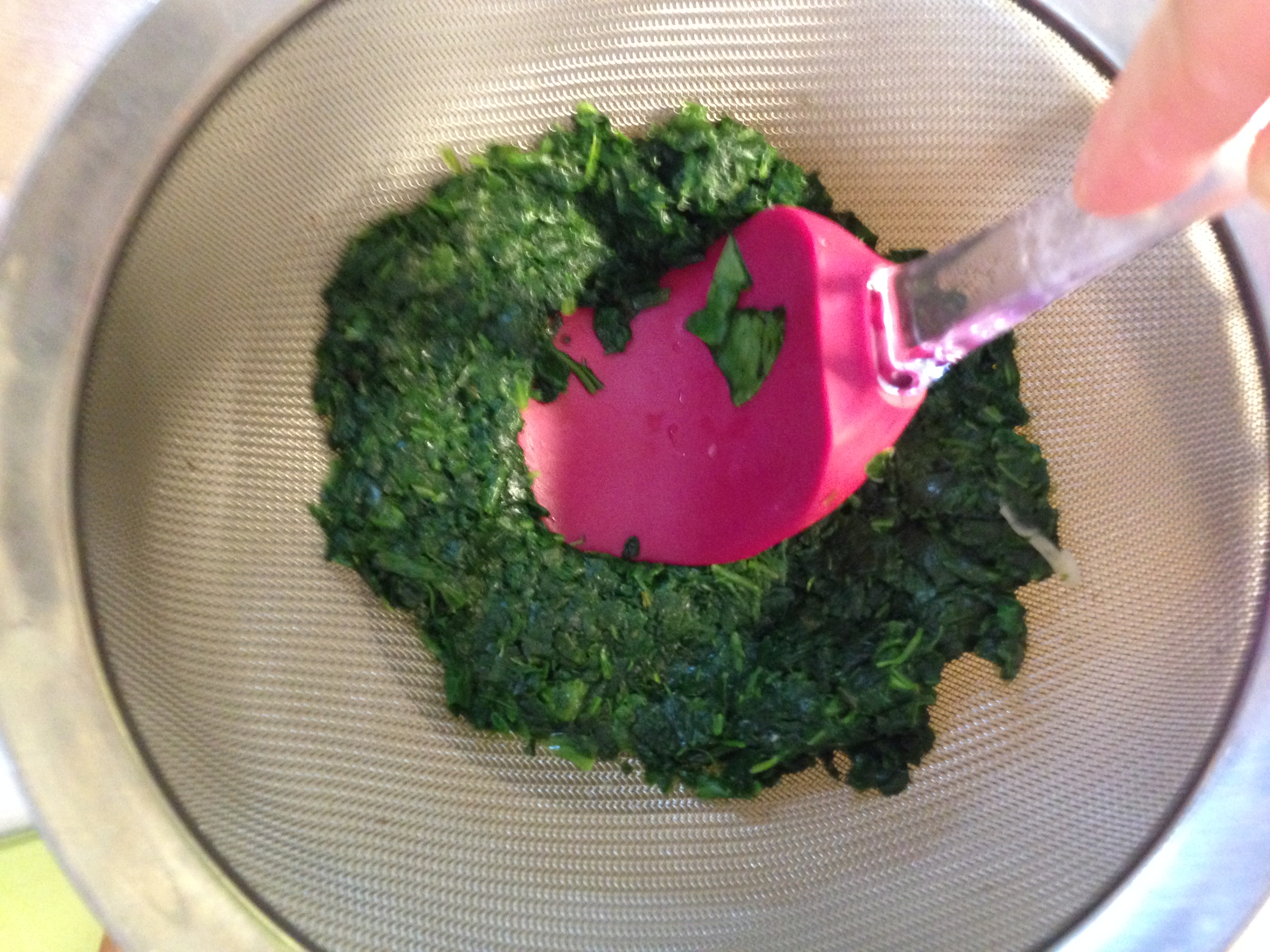 Use a sieve and a spatula to smoosh the moisture out of the thawed spinach. Drier is better for this recipe.
