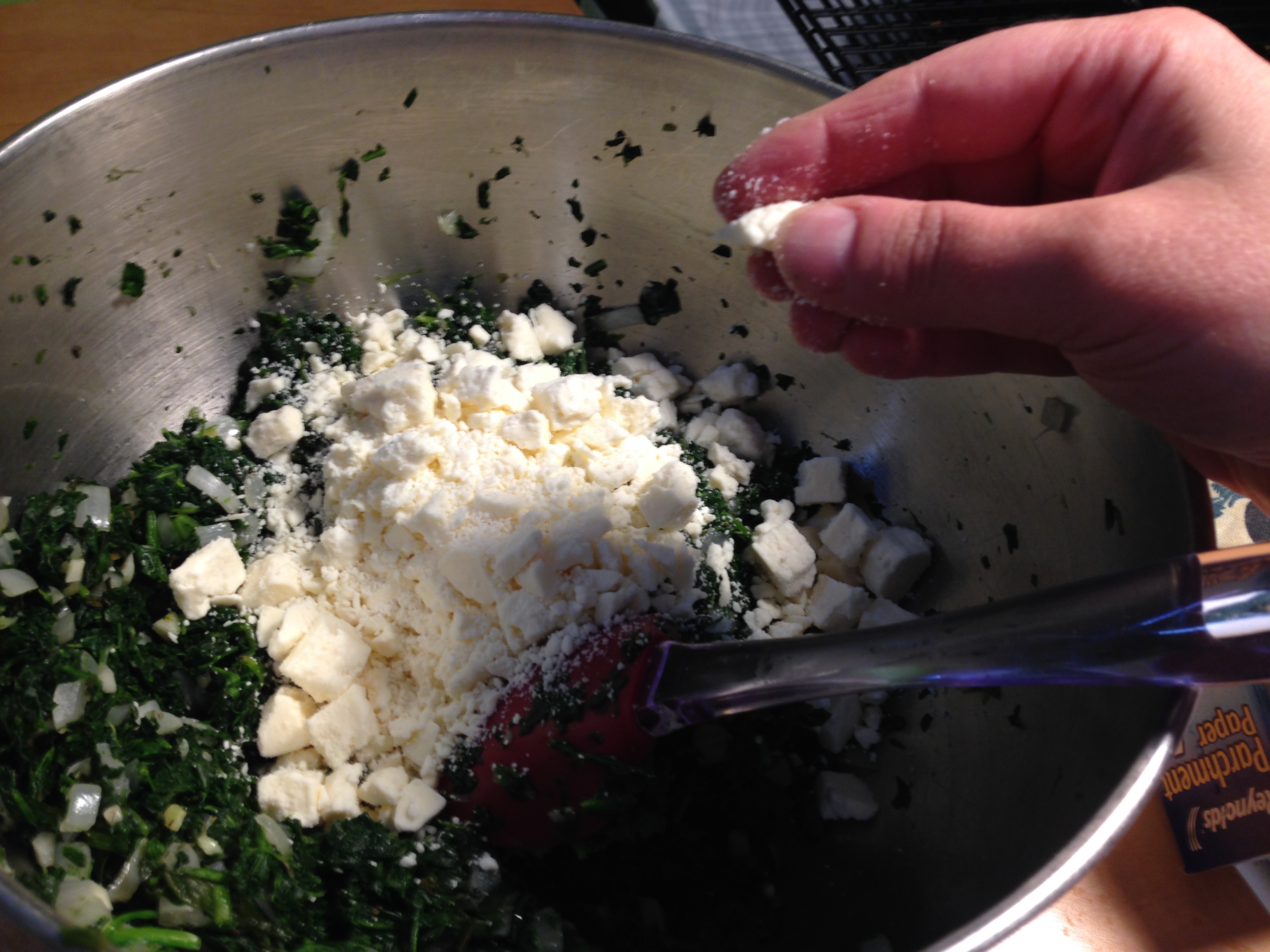The ideal snack for a game table is compact, easy to eat by hand, and not messy. Indeed, many historians claim that the sandwich was invented to allow for simultaneous card play and snacking. I decided on a miniaturized, decidedly sandwich like, spinach pie. I improvised the recipe based on a spinach nugget recipe I have committed to memory.