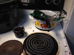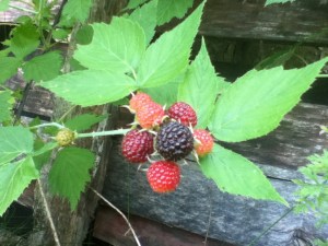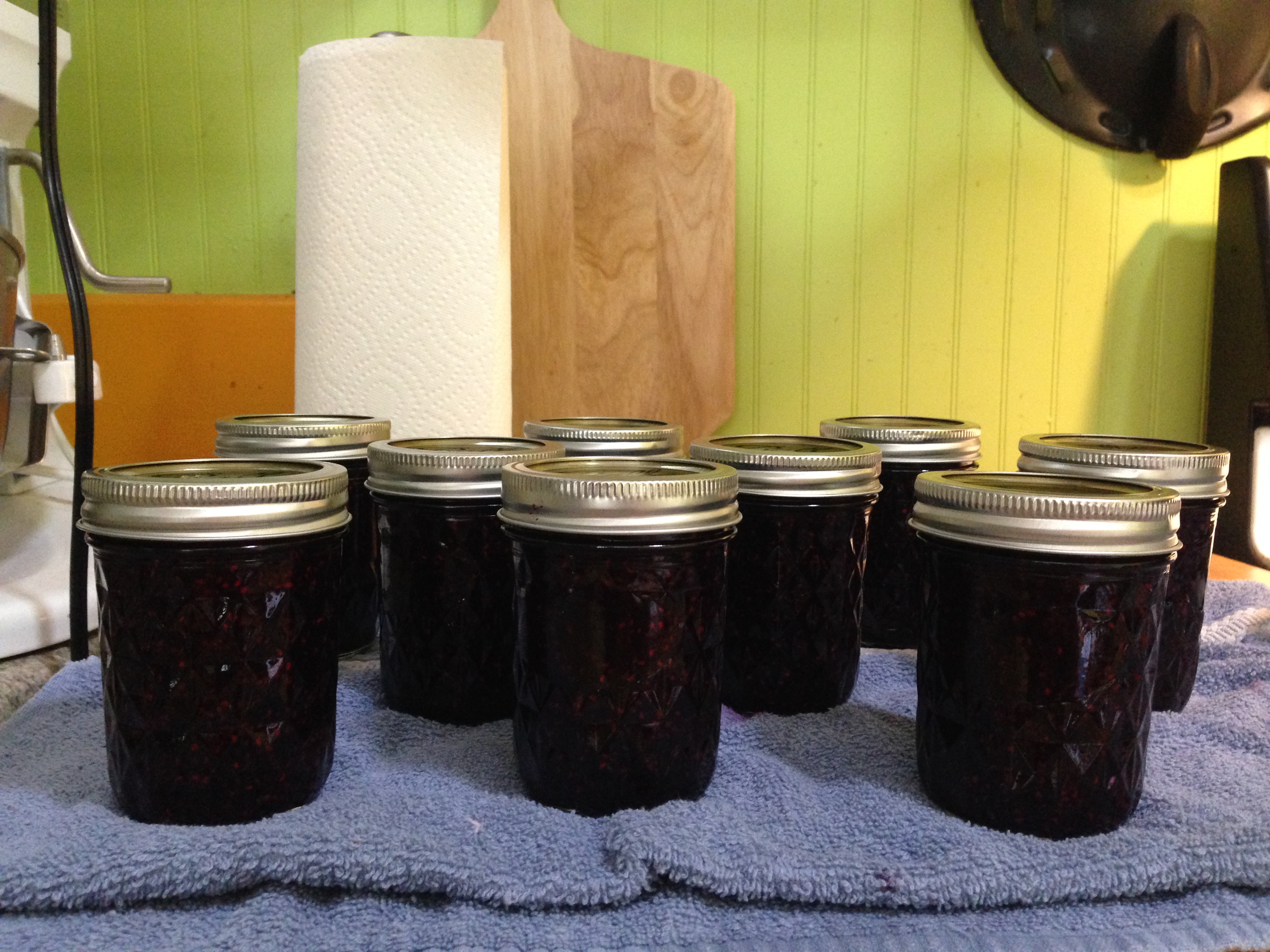 Also, the next sub-season is beginning: wild raspberry season. We have a huge clump of thorny, tangled raspberry canes along one fence in our yard. There is another clump behind the garage. Other than cutting them back every fall (or every third fall…) we do absolutely nothing for them, but they produce plenty of fruit. This year they are producing even more than usual. I managed to pick about three and a half pounds of ripe berries over two days. That just happened to be just enough for a batch of home-made raspberry jam.