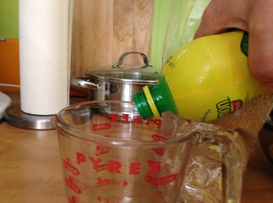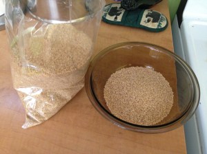I found plenty of cherry tomatoes ripe for the picking, as well as a small bell pepper that had a hole in it. I decided we needed to eat the pepper before it rotted, so I chopped it and added it to the quartered cherry tomatoes, diced cucumber, and minced parsley. You can eyeball these. It is a salad, not a souffle. I used all of the cherry tomatoes I picked that day and one small salad cucumber. There was about a cup of minced parsley. Besides, it’s really hot and digging out the measuring cups takes work. I decided to leave out the mint, as it aggravates my acid reflux. Call that heresy against tabouleh, but it is my dinner and my esophagus, so it is my rules. You could also add some finely diced onion if you want. Again, my tummy does not get along with raw onion these days, so I left it out.