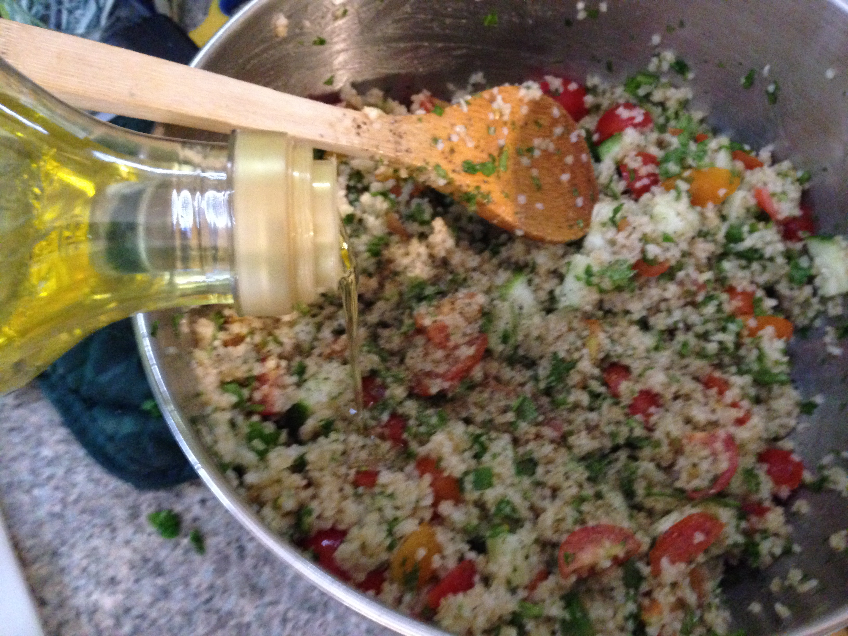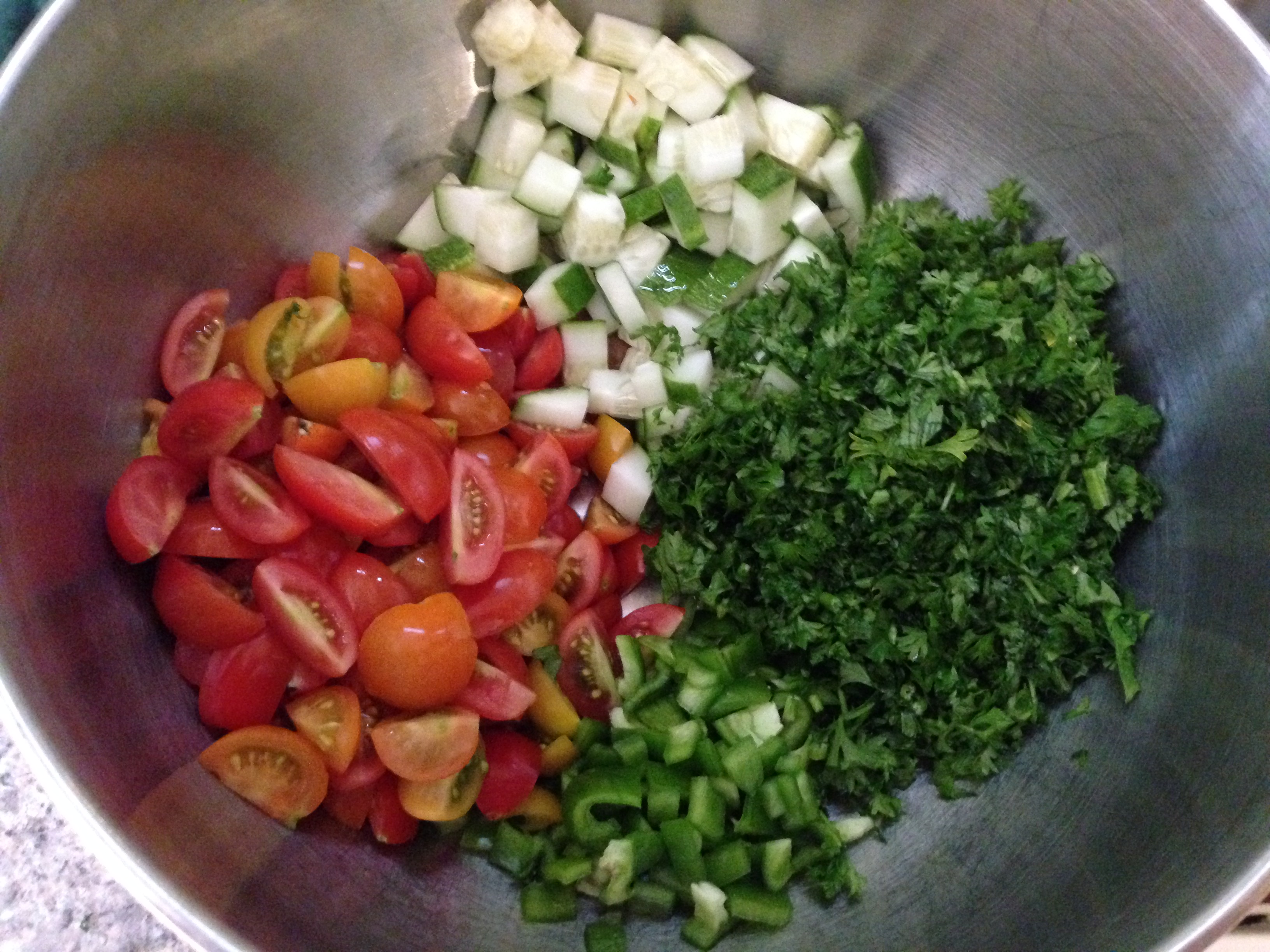Now, for the last bit of work you have to suffer through in this darn heat. Mix the cooked bulgur with the veggies and herbs. Drizzle with olive oil, season to taste with salt and pepper. There you go, you have tuhboolee. Chill until it is time to eat. Like most dishes that involve blended flavors this is even better the next day.
