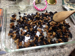 Mr. Food It yourself chose a properly sophisticated assortment of raisins, chopped figs and chopped prunes for the fruit component of his granola. Here they are being separated for easy incorporation into the final mix. Dry fruits can get a little sticky.
