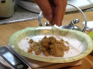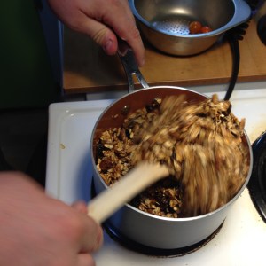 While the nuts and grains are toasting and smelling awesome he got the sticky stuff together. Being fond of doing things properly, Mr. Food It Yourself chose to weigh the honey and brown sugar, as they were listed by weight in the recipe. Yes, these are ingredients that are usually measured by volume. However. The Proper Way to Follow A Recipe is to use the units the recipe notes. If the recipe says ounces, you weigh out ounces. If it says picolitres, you…well you probably look for another recipe because who has the means to accurately measure volume in picolitres? Seriously, don’t bother with that recipe. But I digress….
