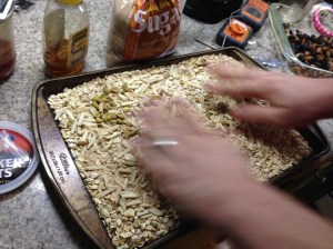 The oats, wheat germ, almonds and pistachios (taking the place of sunflower seeds from the original recipe) went for a toasting in the oven. Why did he use pistachios? Mr. Food It Yourself explains, “I like ‘stashios”. Reason enough for the adjustment, I say.