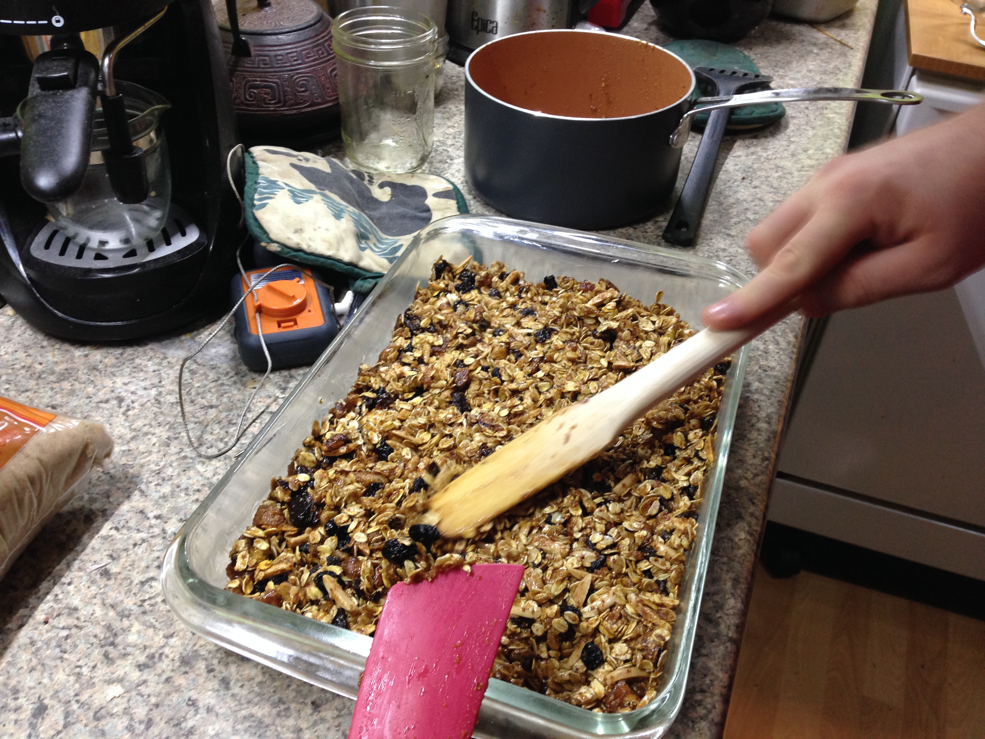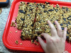 Mr. Food It Yourself, tried to cut the granola into bars, but it proved just a bit too crumbly. That little hand stealing a lump of sweet cereal goodness had NOTHING to do with that, I promise.