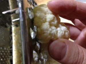 I mixed the shredded cauliflower and the cheese-egg binder, then swept the floor as the oven completed heating. I had no idea a box grater could throw cauliflower shreds so far across a kitchen.
