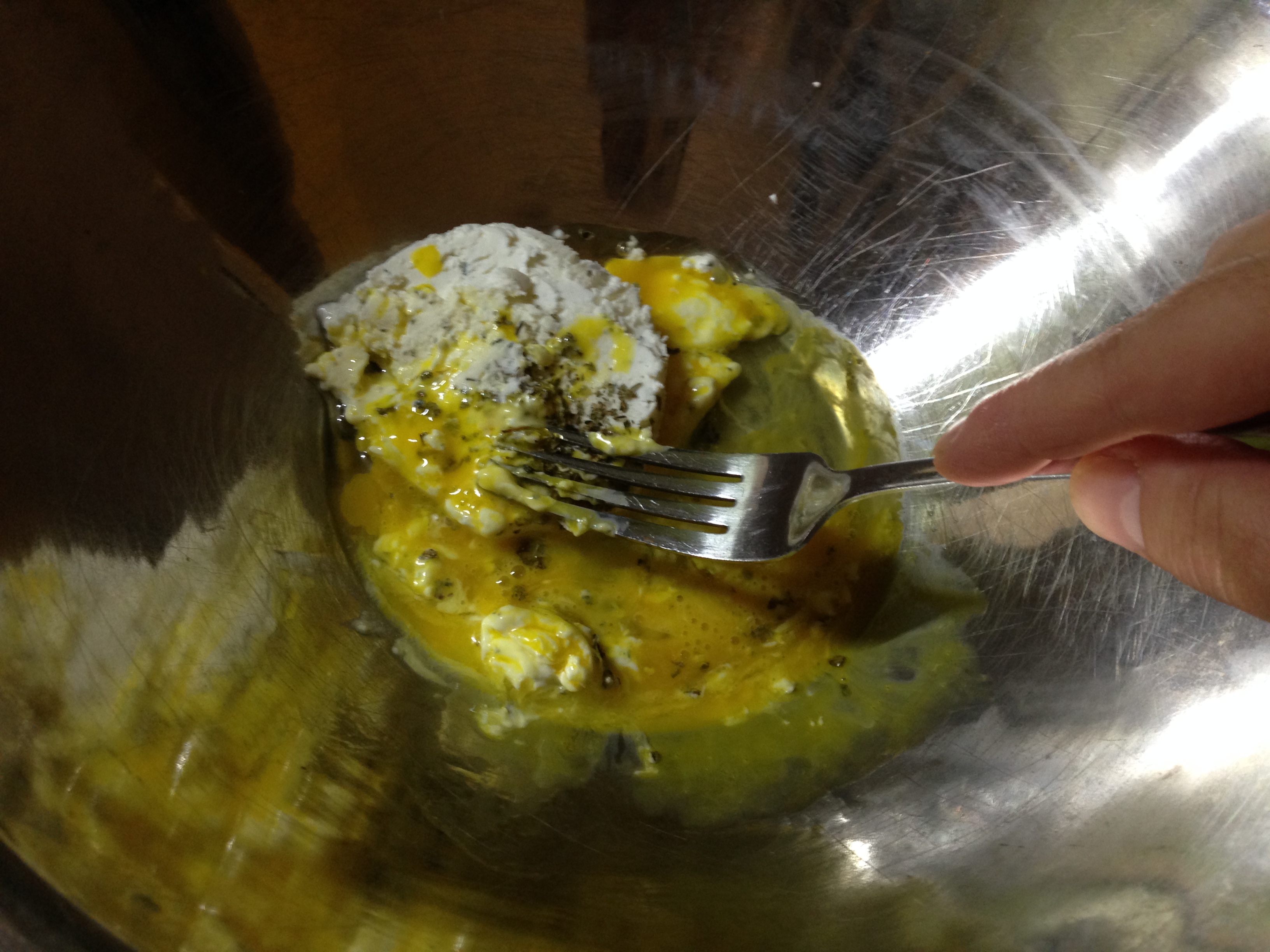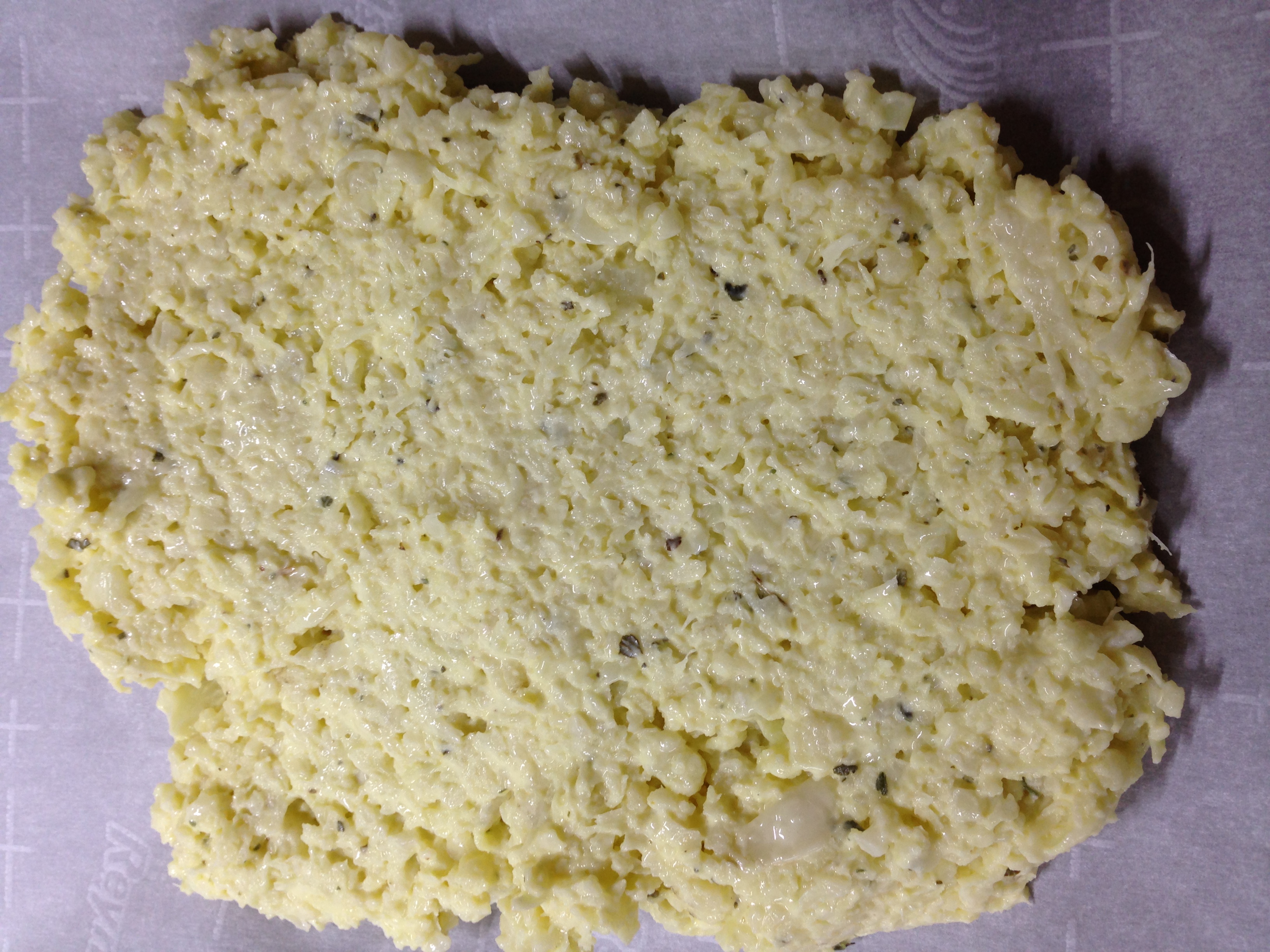 ingredients together. A fork made smashing the goat cheese and incorporating it into the egg, salt and oregano quite easy. As directed in the recipe, I squeezed the excess water out of the cooked cauliflower. It took both hands, so I did not get a picture. I was surprised by how much water I was able to expel. The shreds did indeed end up looking dry.