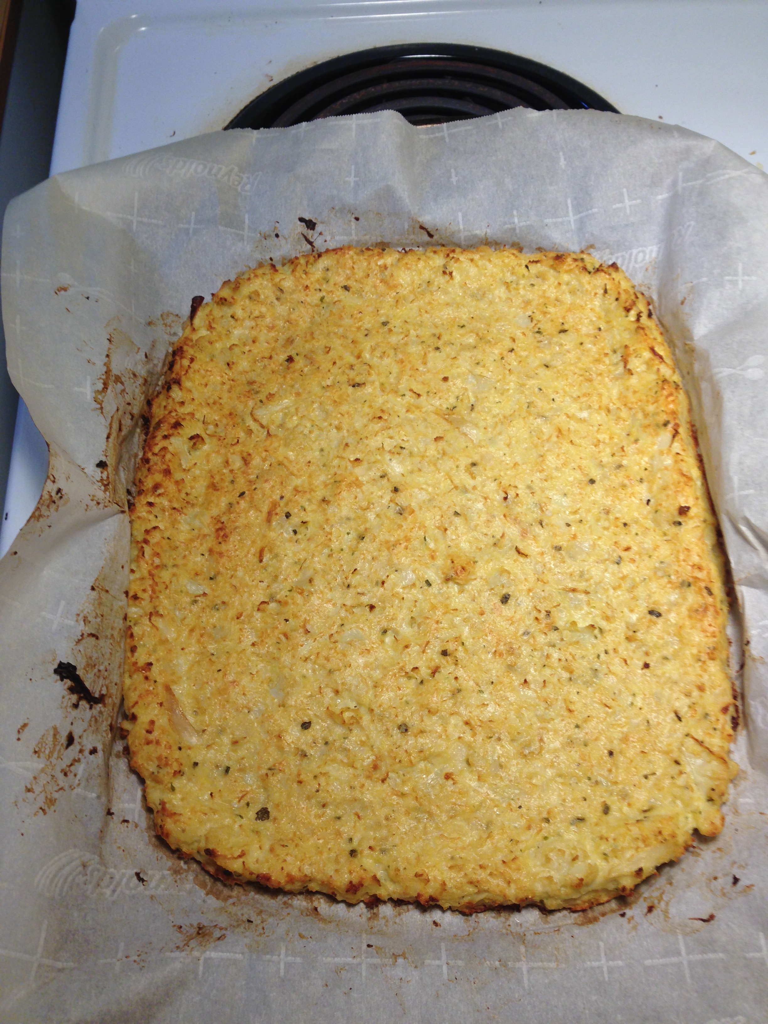 The recipe writer claims this crust will fool your family. It will most likely not. It tastes distinctly of cauliflower and goat cheese. It does hold up under the weight of toppings and can be eaten by hand, however. Mr. Food It Yourself and I enjoyed this, although it is not at all the same as a slice from our local pizza joint.