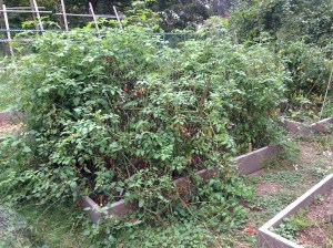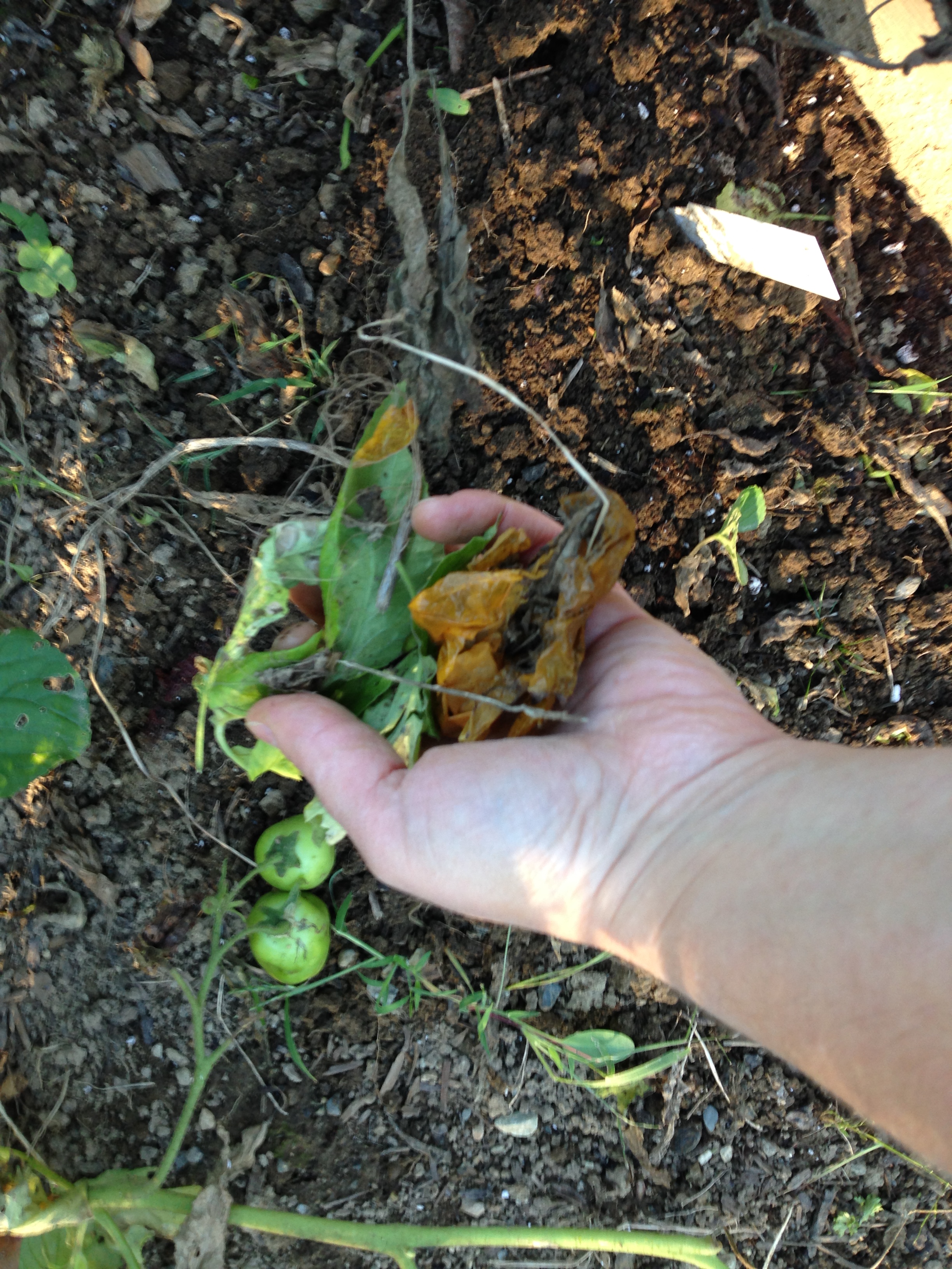 I very carefully picked up as many leaves from the tomato plants as I could. A few had suspicious looking eggs on them. I certainly do not want those hatching in my yard next year. All the vines that I pulled went into paper yard waste bags and are now decomposing in my town’s yard waste drop off site.