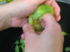 It took a while to get all the tomatoes chopped. The closer-to-ripe ones needed their seeds removed. Most were so hard and green they had not developed seeds yet so I just chopped them small.