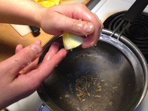 The easiest way to juice a lemon? Roll on the counter top to break it up inside. Slice and squish the cut fruit over a strainer. No gadgets needed, no seeds to pick out of the juice- I call that easy.