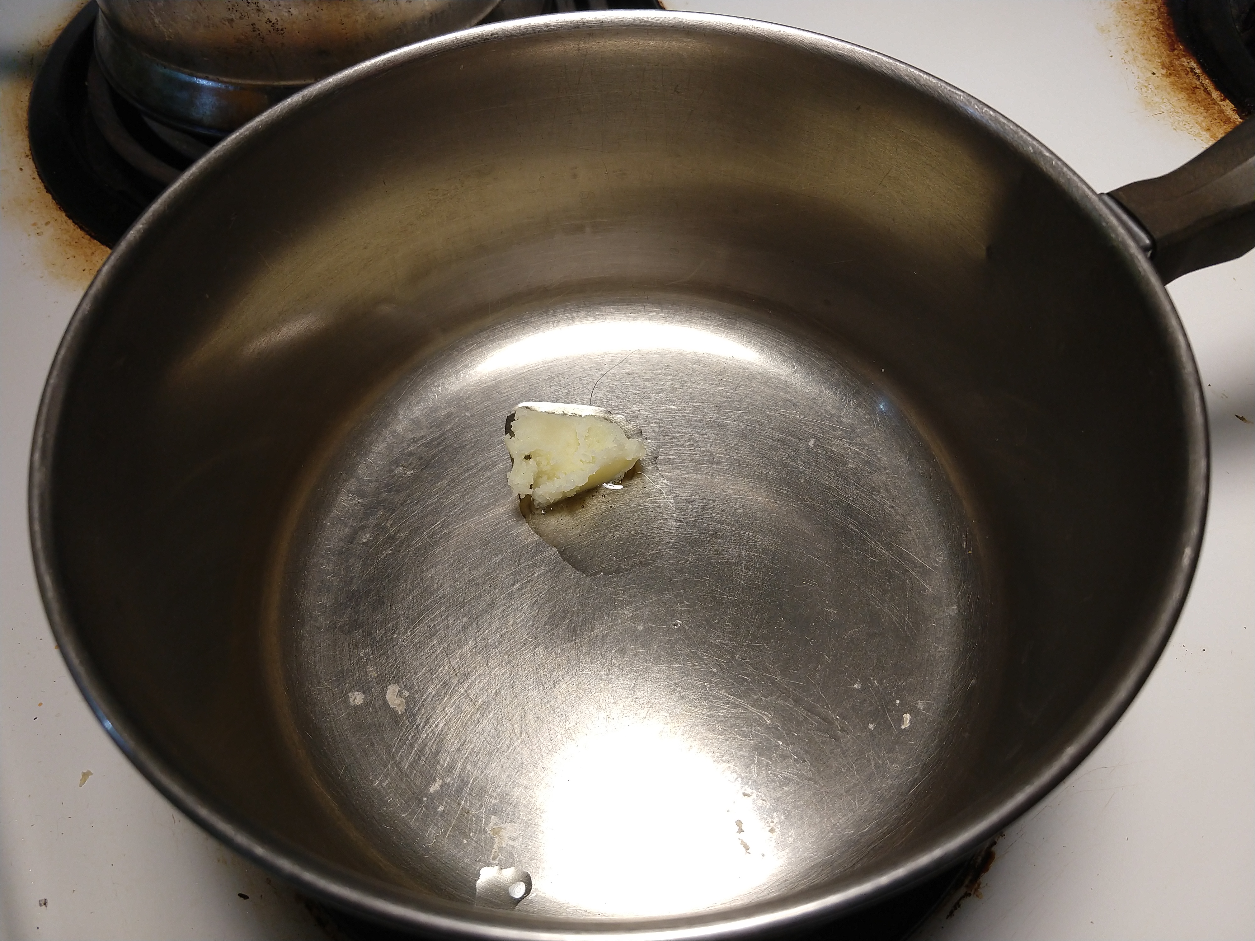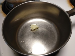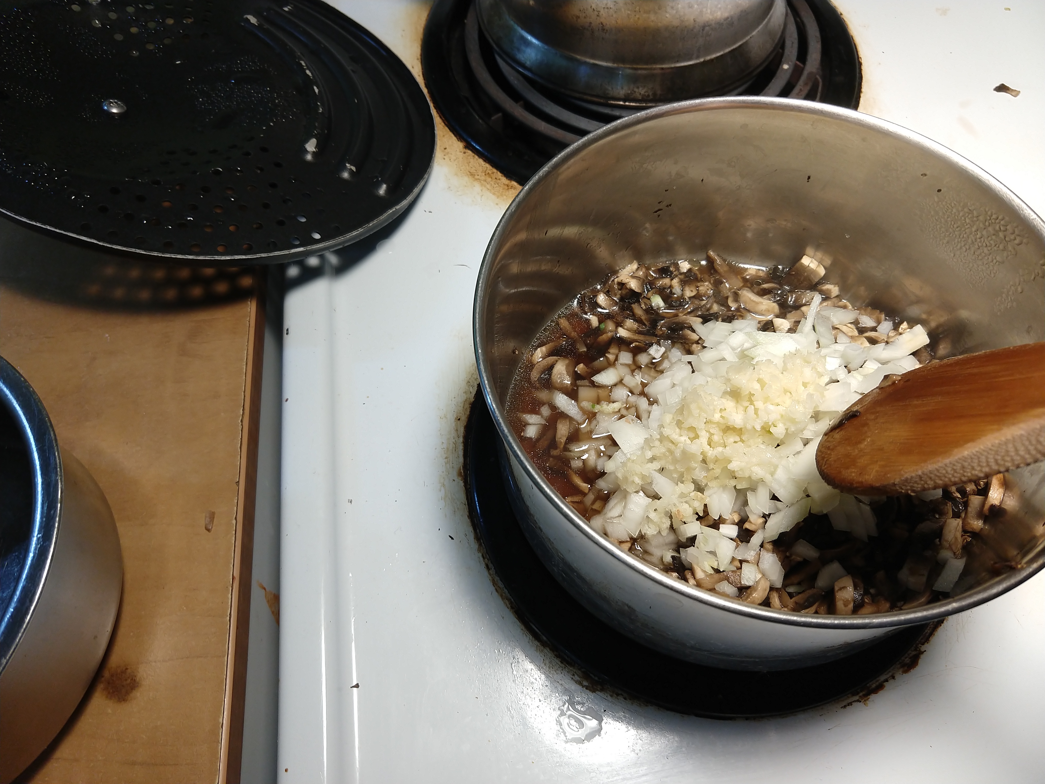 Don’t waste that 15 minutes. Finely chop half an onion and five cloves of garlic. Add the garlic and onion to the pan.