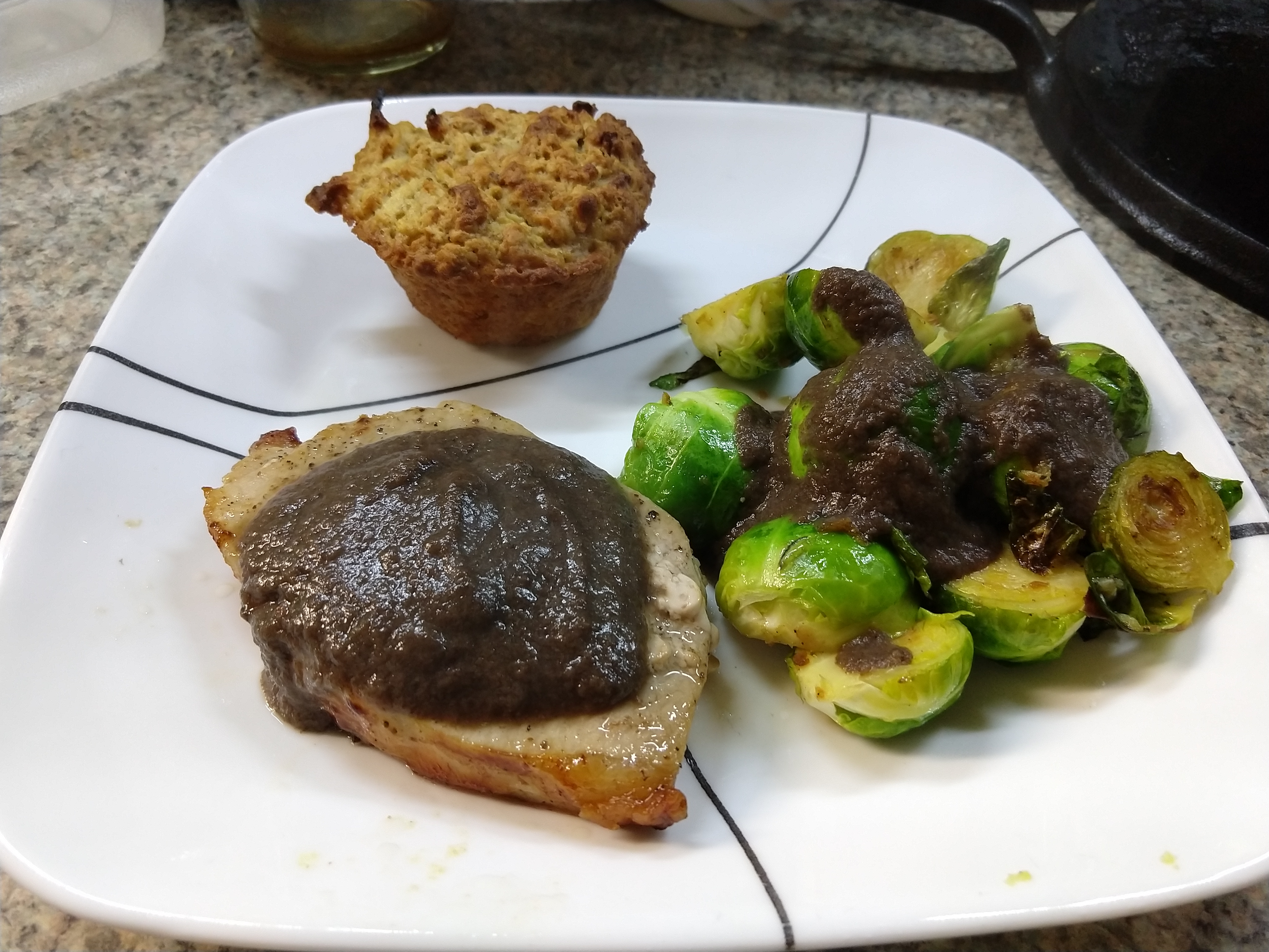 Tonight, I made a scrumptious Sunday dinner with some of my favorite foods: broiled pork chops with mushroom gravy, sautéed Brussels sprouts, and muffins. Gravy is not my strongest cooking subject, but I made it because I had a 12 ounce pack of mushrooms that was going to go bad if I did not use it soon. Food waste is bad. I try to avoid it at all costs.