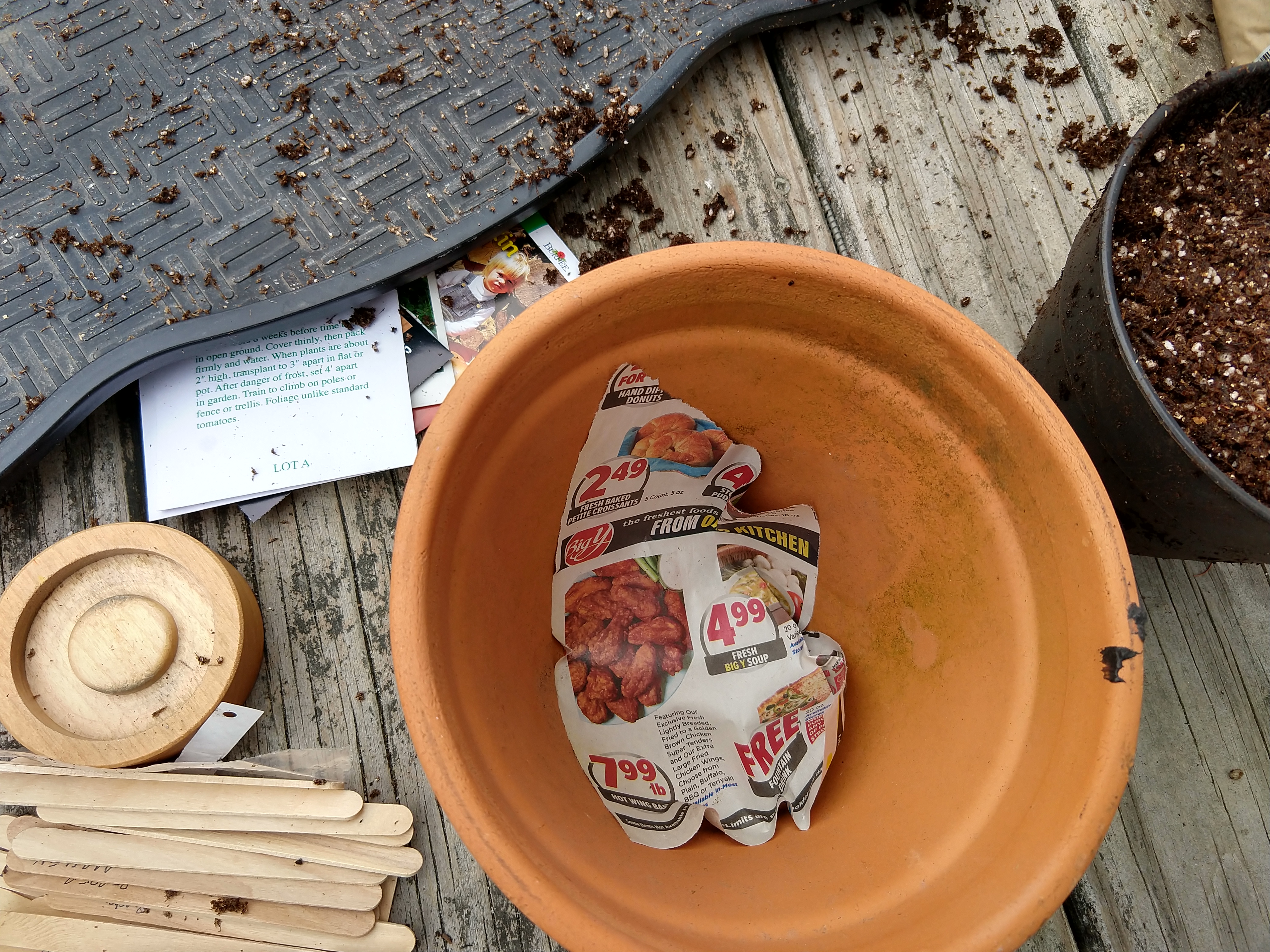 A little scrap of newspaper in the bottom of the pot keeps the soil from running out the bottom.