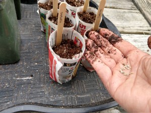 I searched my garage and basement for larger pots for the watermelon and pumpkins. They are “heavy feeders” even as seedlings. I like to fill the pots with damp seed starting soil, then add labels so you can tell one green thing from another. Then, add the seeds and cover with more soil.